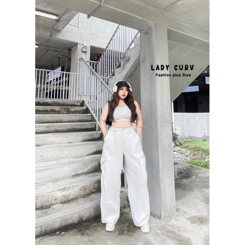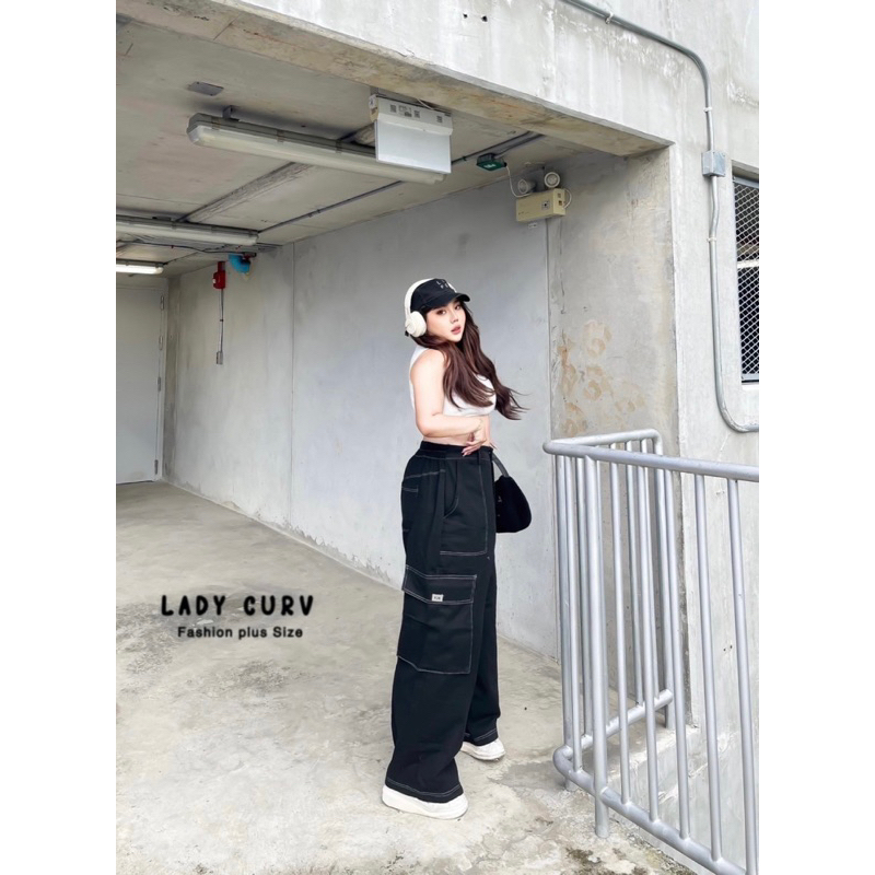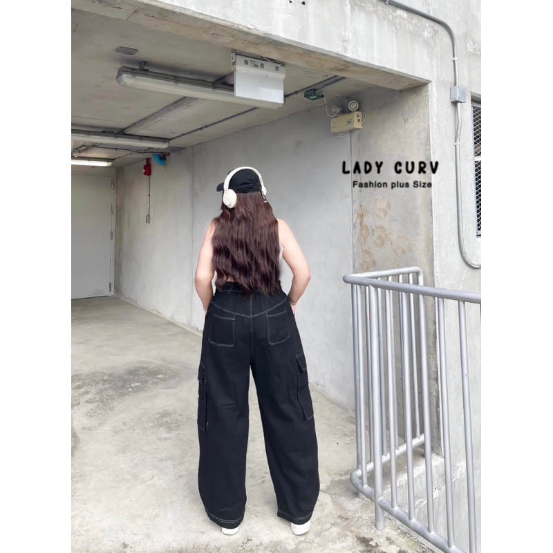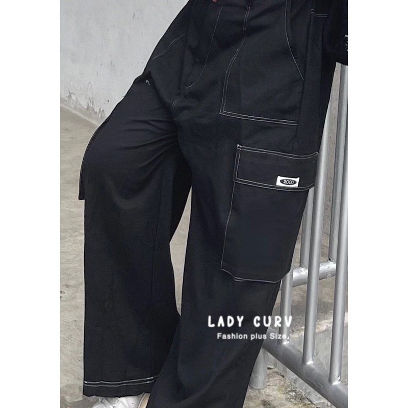 กางเกงขายาวเอวสูงรุ่นY2K คาร์โก้ทรงบอย ดีเทลตัดสีด้าย ไซส์ใหญ่ LC