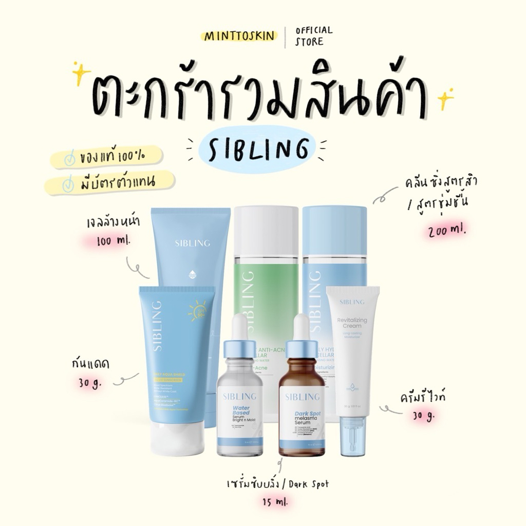 (ลด120.-ในไลฟ์/คลิป) รวมสินค้า ซิบบลิ้ง SIBLING (เจลล้างหน้า เซรั่มลดสิว เซรั่มลดรอย กันแดด ชามิเคิล)