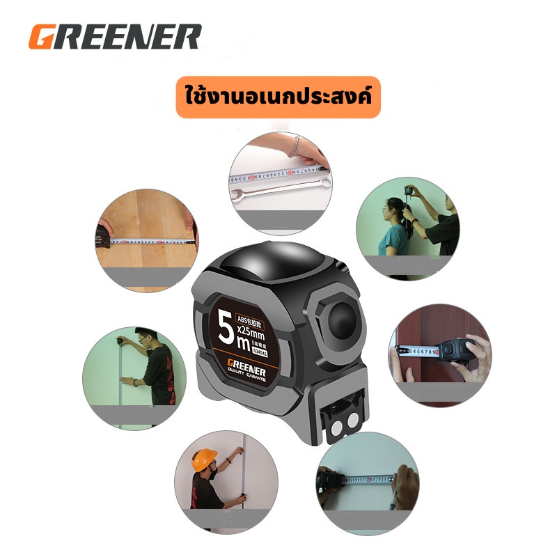 GREENER ตลับเมตร มีขนาด 5m 7.5m ตลับเมตรหุ้มยาง ความแม่นยำสูง หน่วยเซนติเมตร อ่านค่าได้ 2 ฝั่ง
