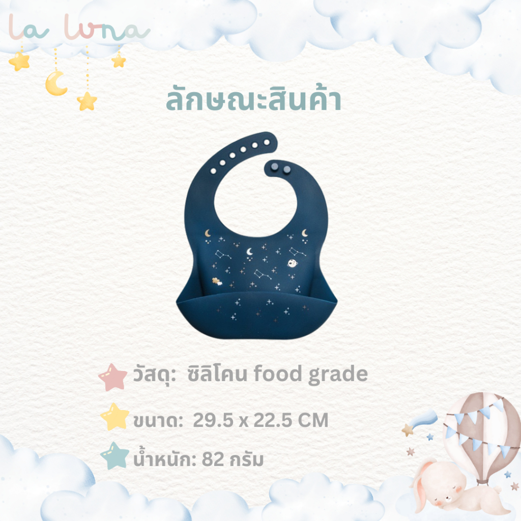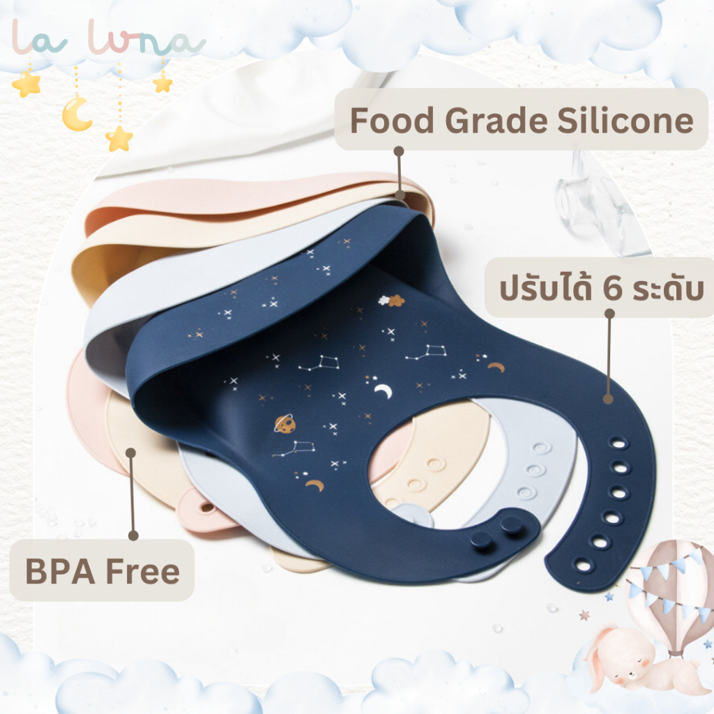 La Luna ผ้ากันเปื้อนเด็ก ผ้ากันเปื้อนซิลิโคน Food grade มีกระเป๋าหน้า ปรับได้ 6 ระดับ (Silicone Bib)