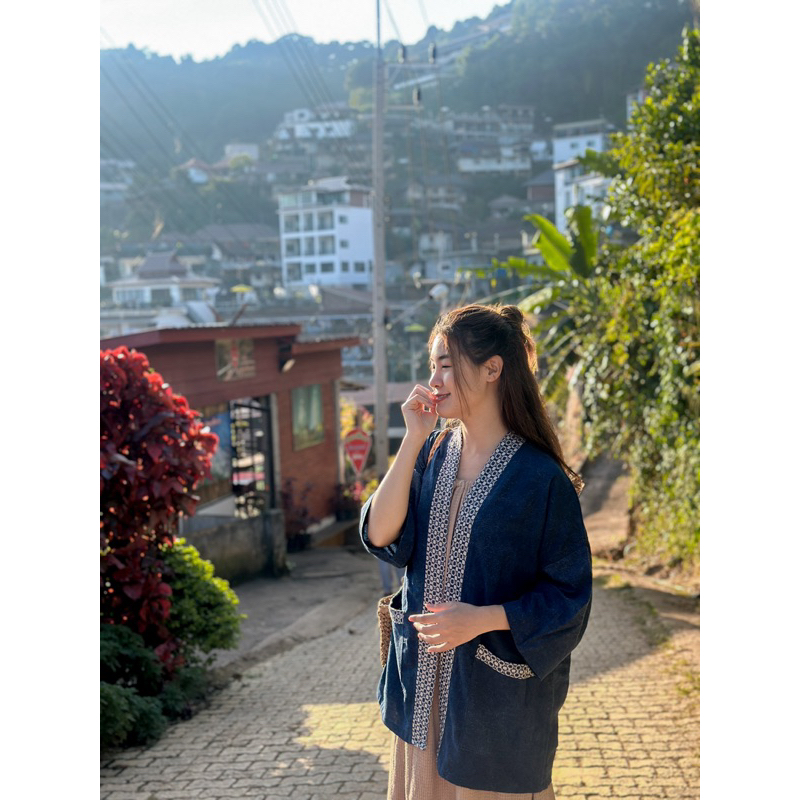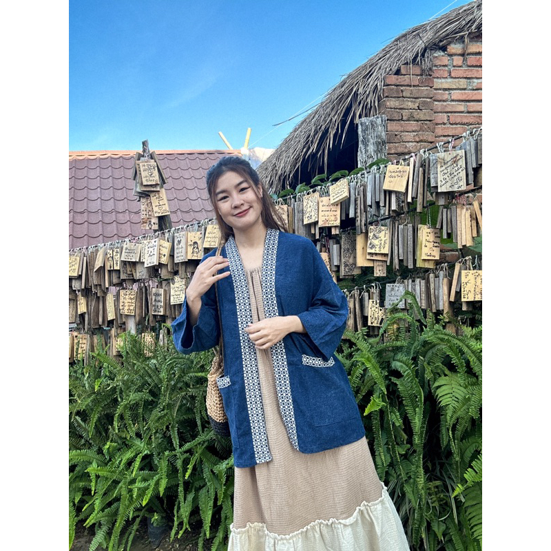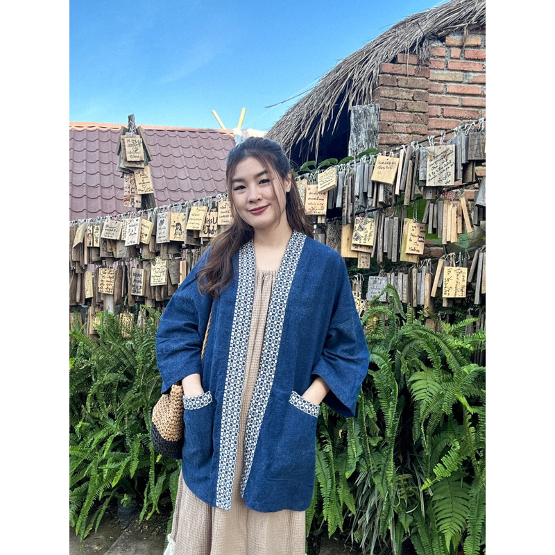 เสื้อคลุมผ้าฝ้าย ย้อมฮ่อมขัดสโตน แต่งผ้าญี่ปุ่น