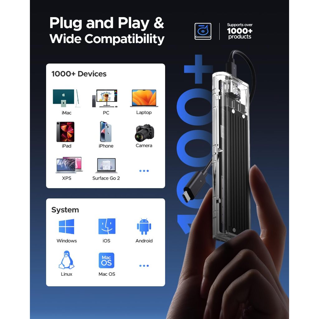 Orico SSD Enclosure โปร่งใส NVME M.2 ถึง type-c 10Gbps การกระจายความร้อนซิลิโคน ฮาร์ดดิสก์มือถือภายนอก (TCM2)
