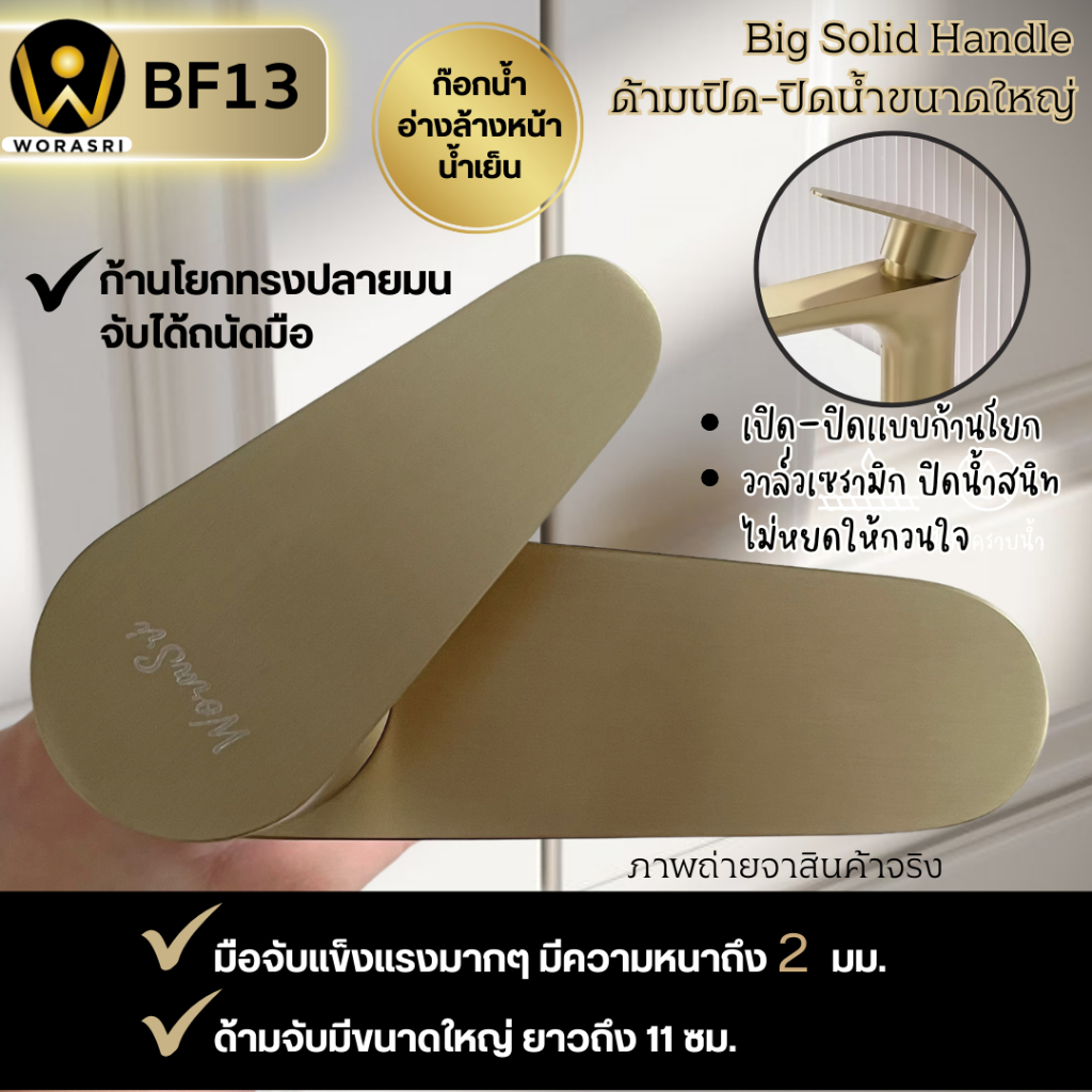 WoraSri BF13 ก๊อกน้ำเย็นอ่างล้างหน้าก้านปัดโยกสวยหรู +สายน้ำดี สแตนเลส 304 สีทองด้าน ก 13 สูง 14 ซม.