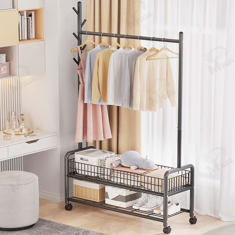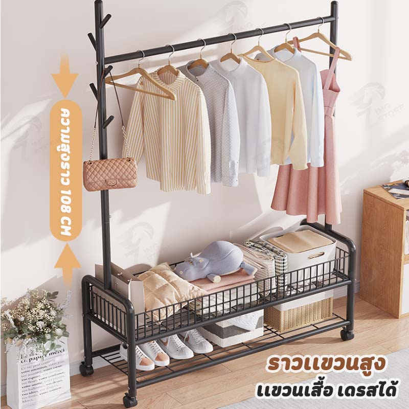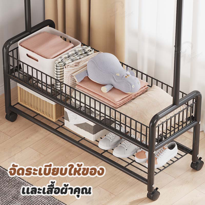 [เสาเเขวนหมวก+กระเป๋า] ราวแขวนผ้า ราวตากผ้า ที่แขวนผ้า พร้อมชั้นวางของด้านล่างพร้อมเสาแขวนกระเป๋ามีล้อเลื่อนโครงเหล็ก FZ
