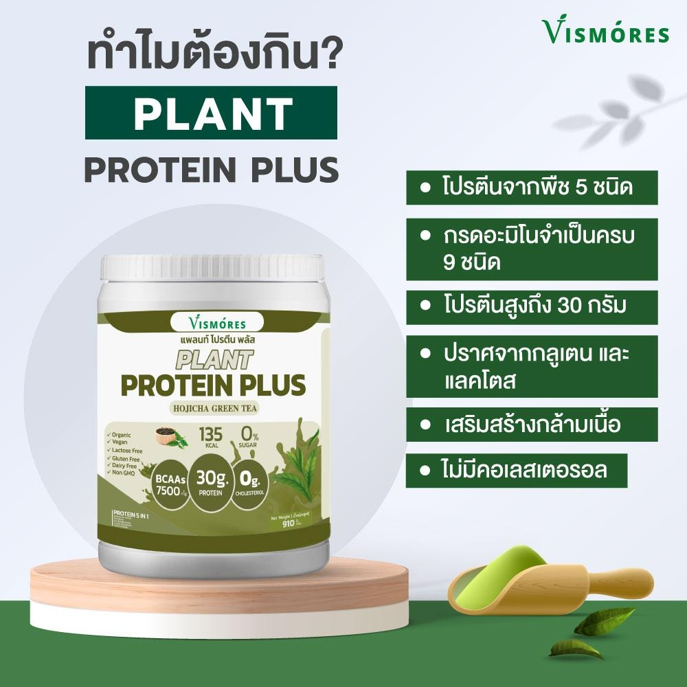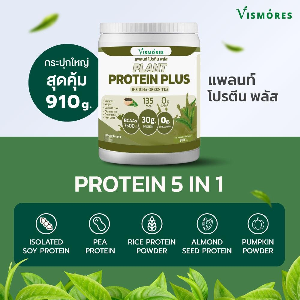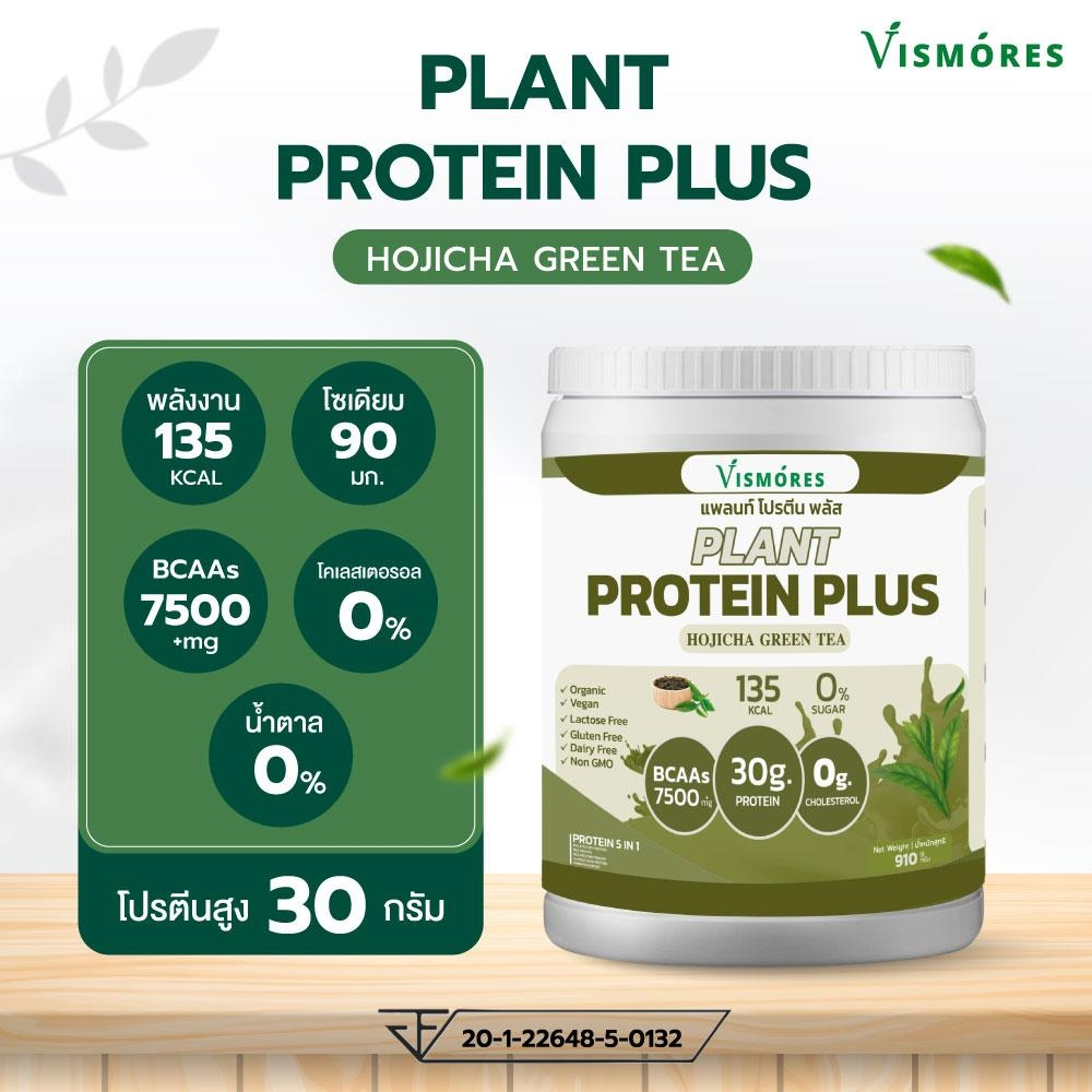 (ส่งฟรี) Plant Protein Plus โปรตีนสูงวีแกน ยี่ห้อ Vismores รส( Hojicha green tea) โปรตีนจากพืชพืช 5 ชนิด 1 กระปุก910กรัม