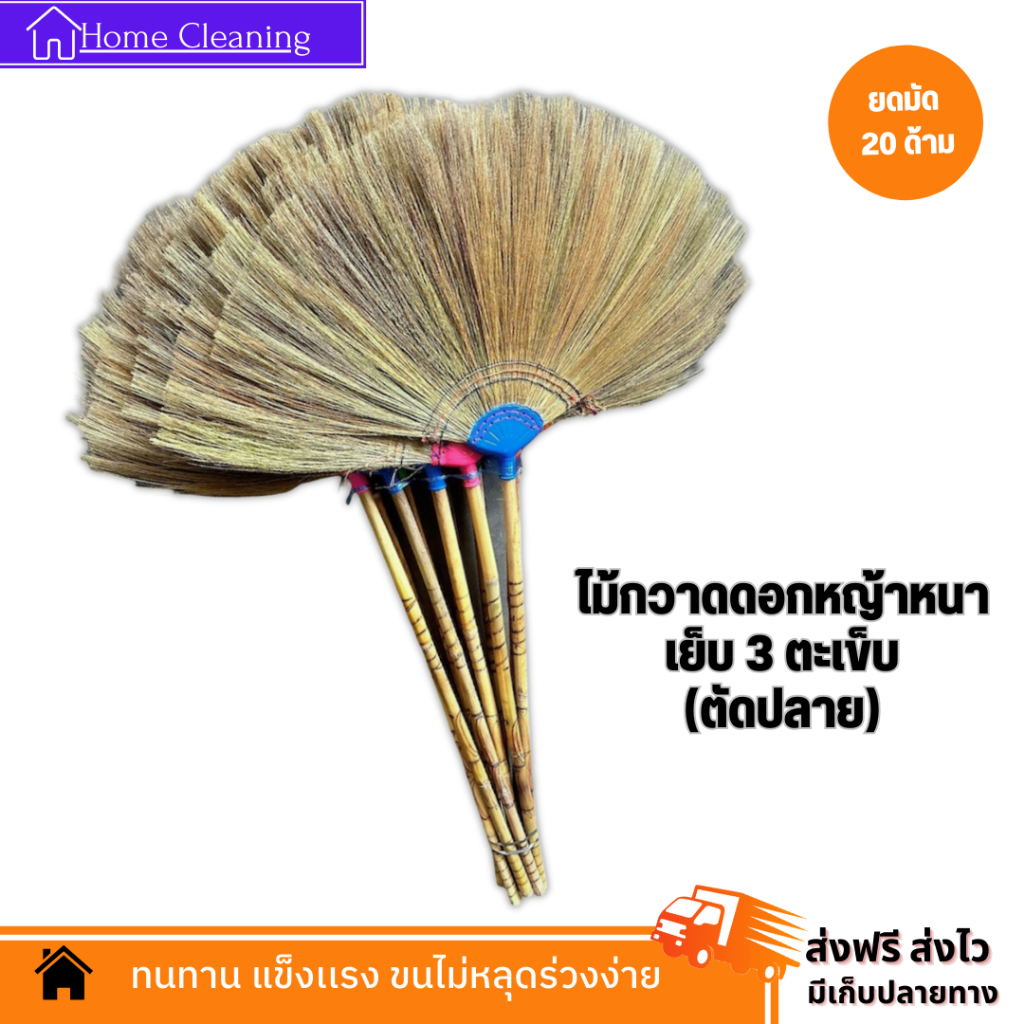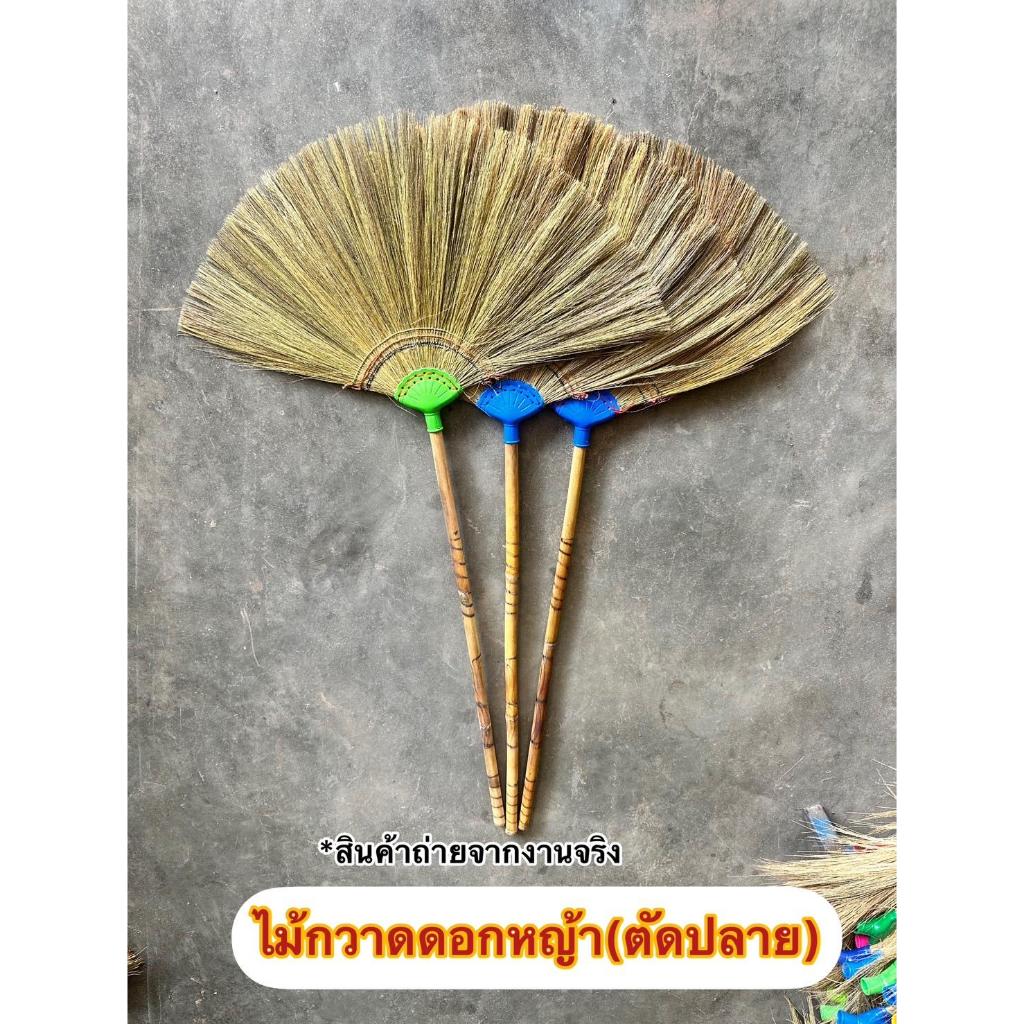 ไม้กวาดดอกหญ้าทำมือ งาน OTOP เย็บ 3 ตะเข็บ (ตัดปลาย) ทากาว ด้ามไม้ลายไทย 80 ซม. เกรด A