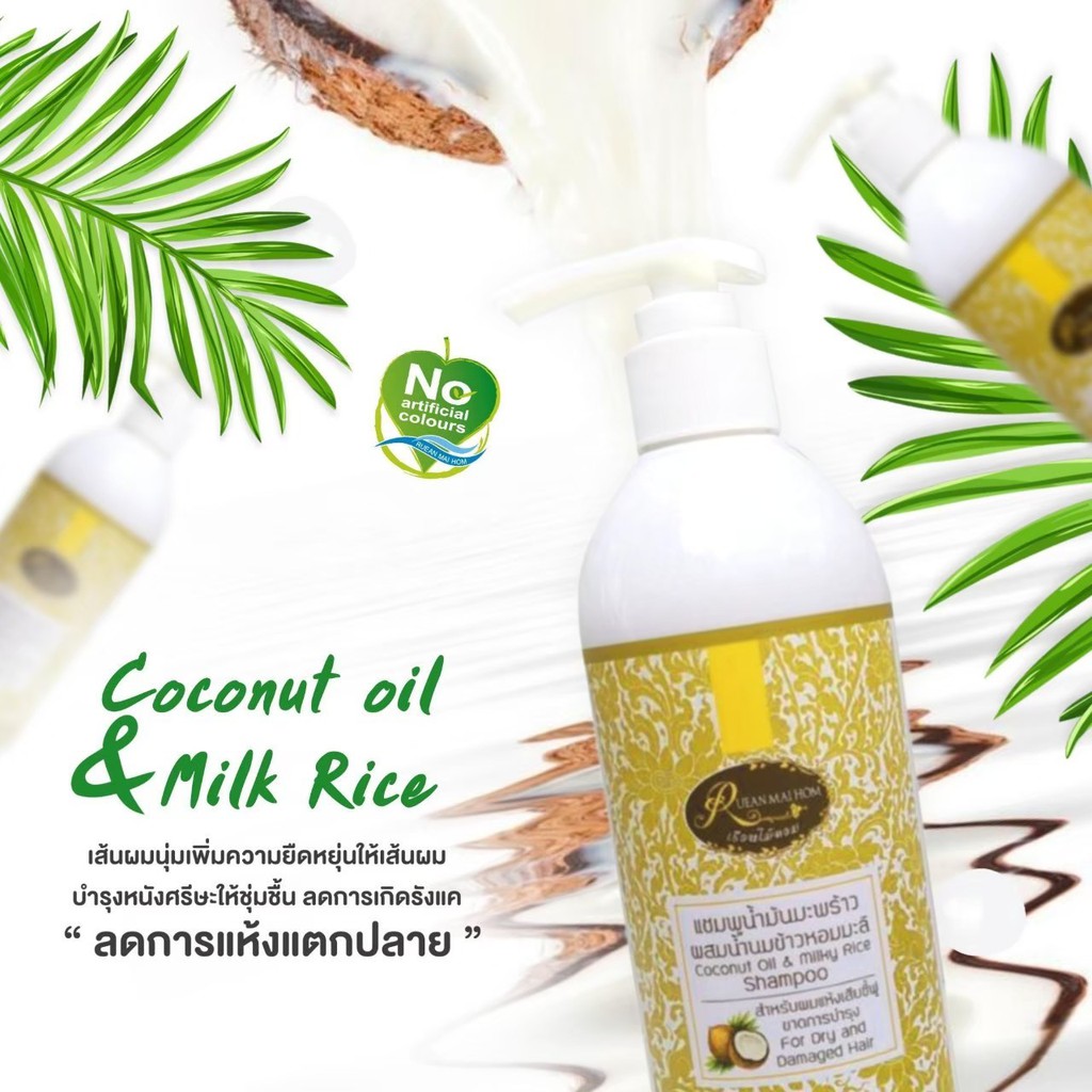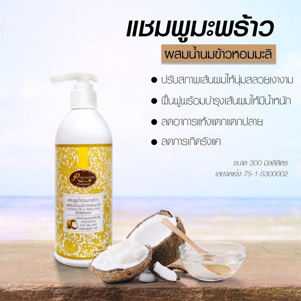 แชมพูน้ำมันมะพร้าวขนาด 300 มิลลิลิตร ลดการชี้ฟูของเส้นผม ผมเงางามมีน้ำหนัก Rueanmaihom เรือนไม้หอม