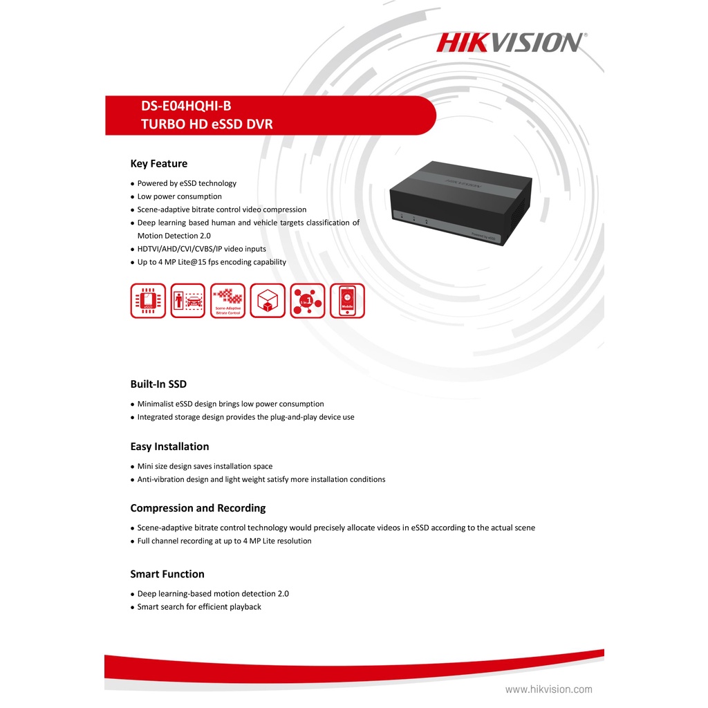 HIKVISION DS-E04HQHI-B eDVR 4CH เครื่องบันทึกกล้องวงจรปิดระบบ HD มีหน่วยความจำ Built-in ในเครื่อง (eSSD 512 GB)