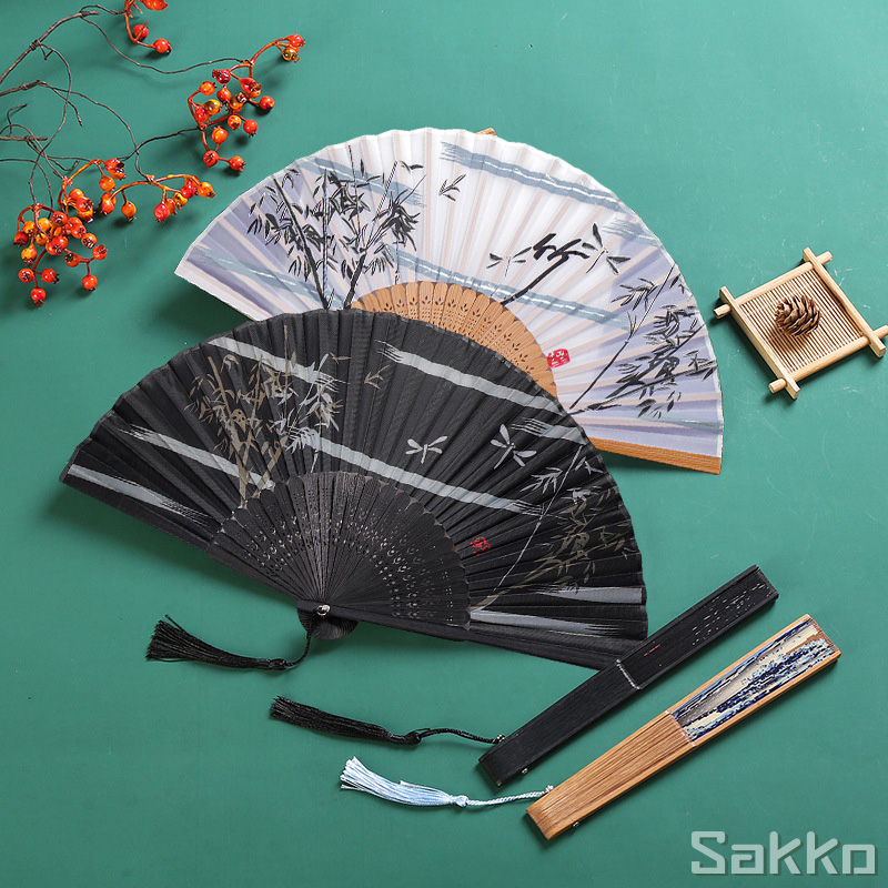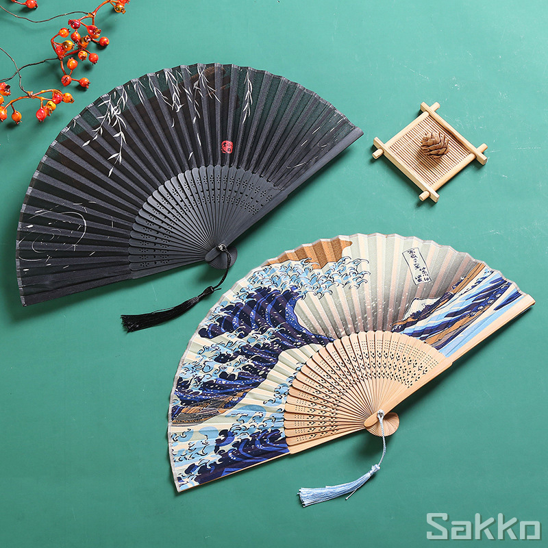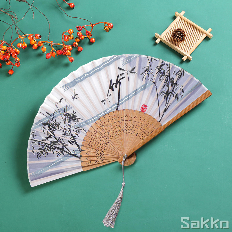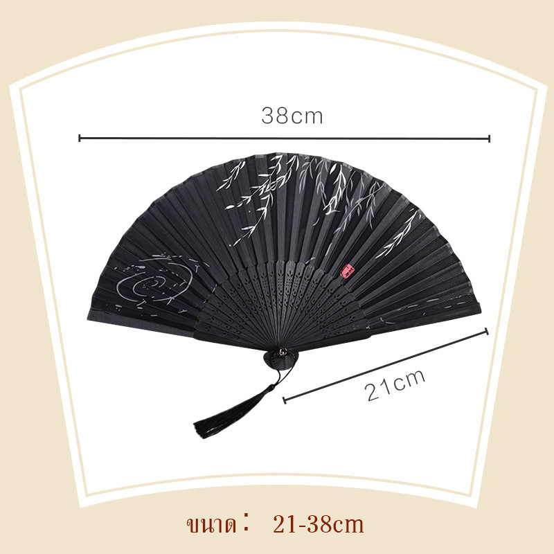 พัด 8 นิ้ว พัดญี่ปุ่น ด้ามไม้ไผ่เนื้อผ้า พัดจีน มีพู่ห้อย พัดมือพับได้ ขนาดเล็กกะทัดรัดดี