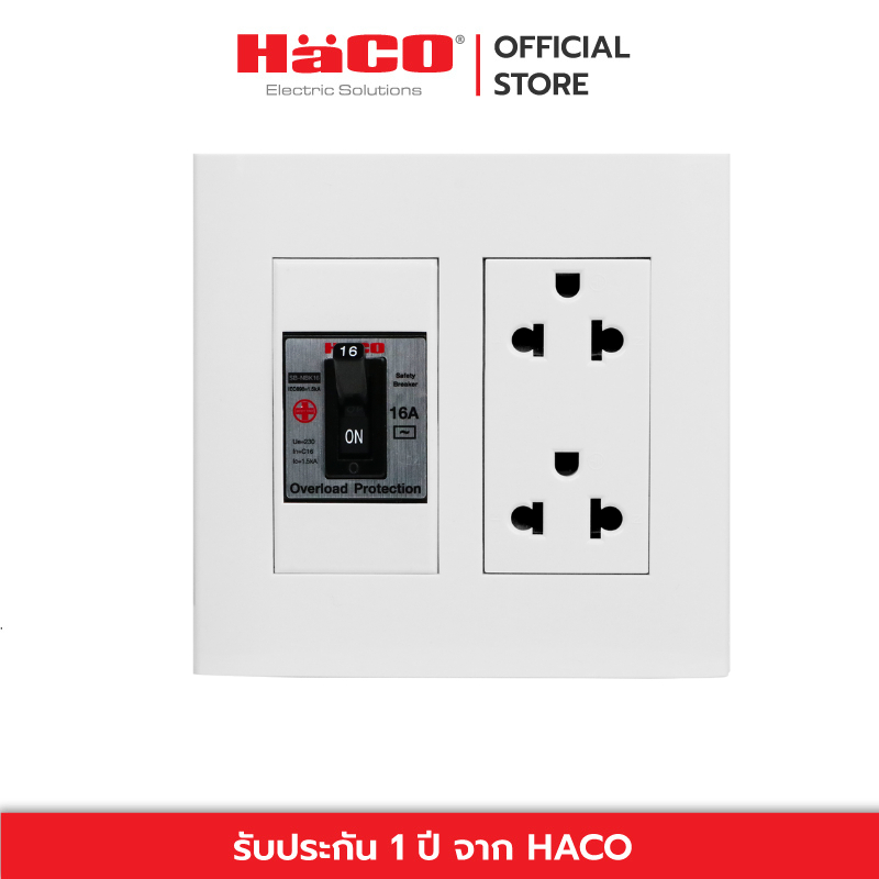 HACO เต้ารับ 3 ขา 2 ช่อง16 แอมป์ 250 โวลต์ และเซฟตี้เบรคเกอร์ 16 แอมป์ (สีดำ) พร้อมหน้ากาก รุ่น W8416V2/NBK16