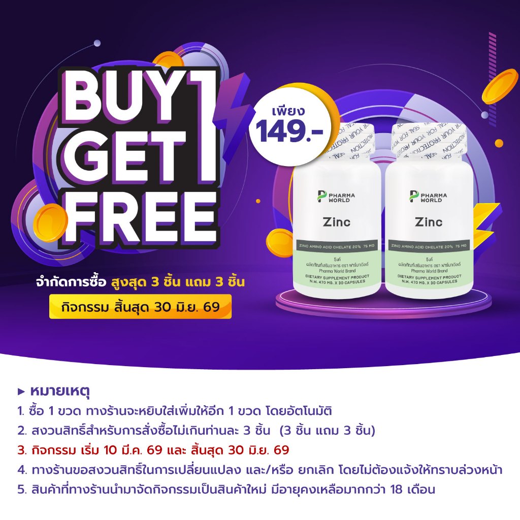 [ซื้อ 1 แถม 1] ซิงค์ Zinc ฟาร์มาเวิลด์ Zinc Amino Acid Chelate Pharma World ซิงค์ อะมิโน แอซิด คีเลต แร่ธาตุสังกะสี