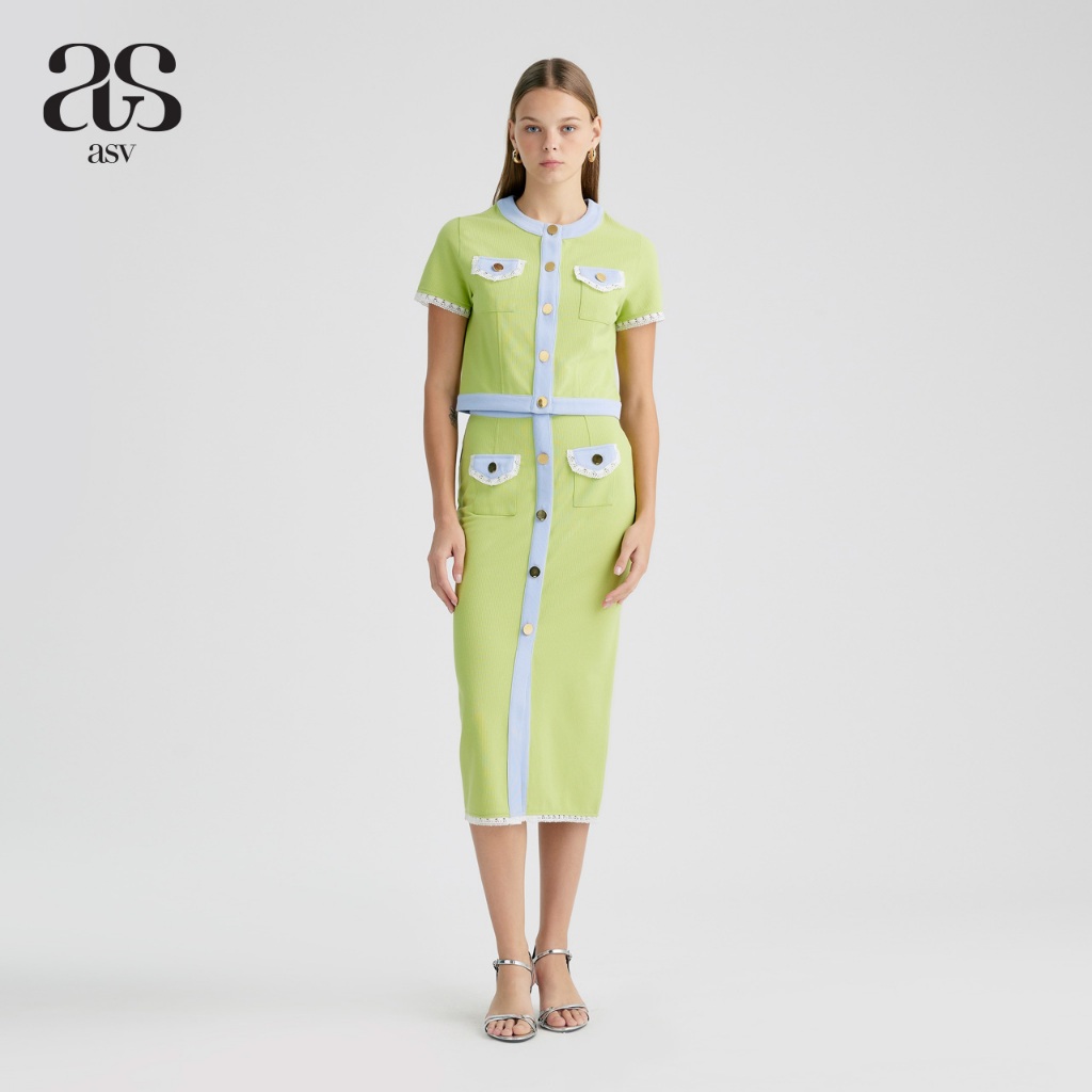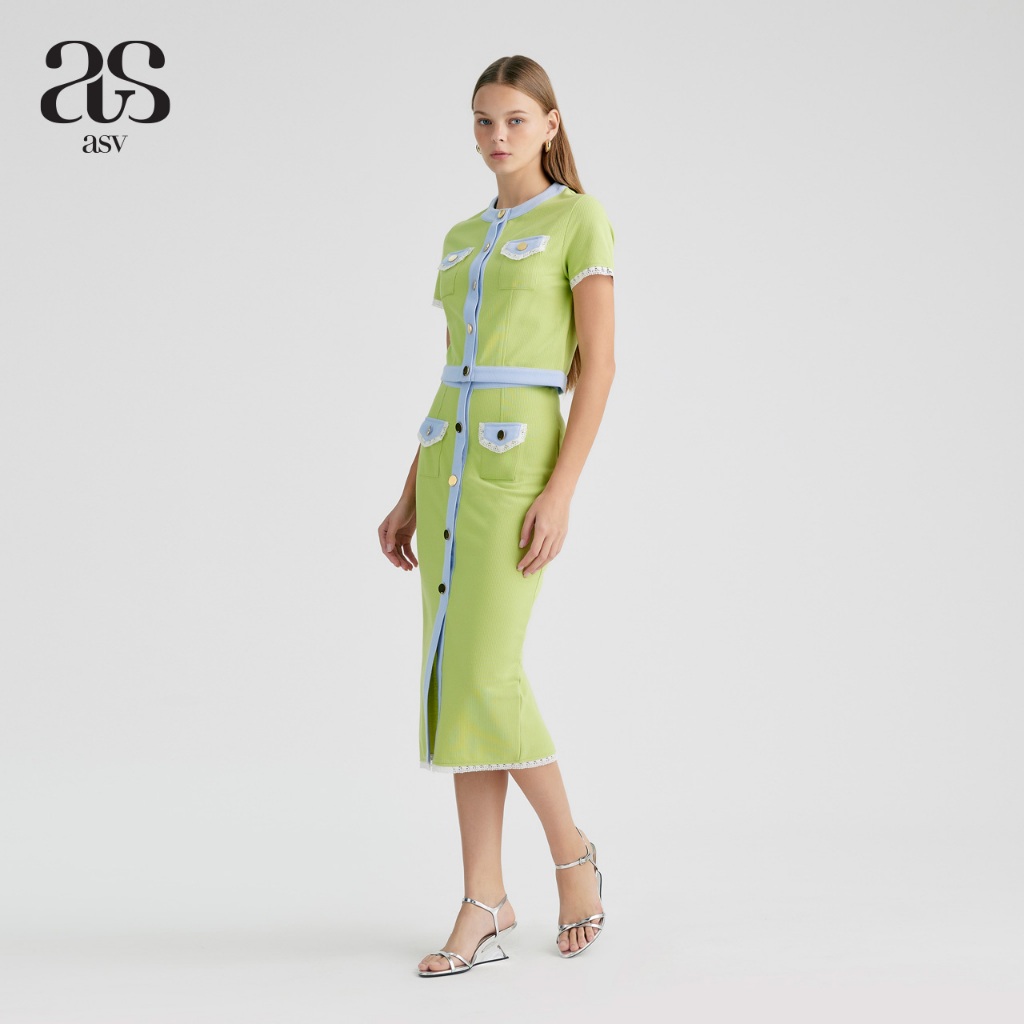 [asv ss24] Gemy Skirt กระโปรงผู้หญิง ตกแต่งกระเป๋าและกระดุมหน้า แต่งผ้ากุ๊นและลูกไม้ที่ชายกระโปรงและด้านหน้า