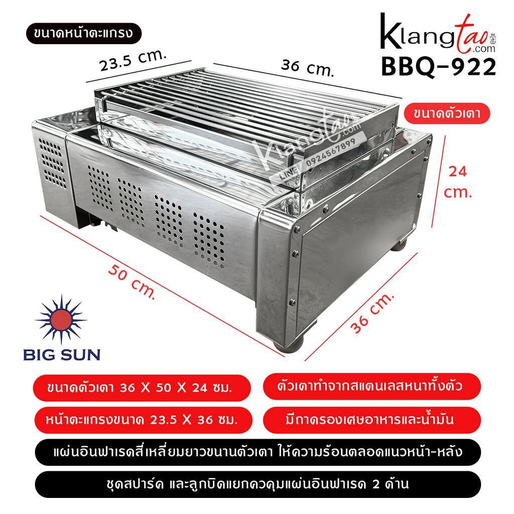 BIGSUN เตาย่าง ใช้แก๊ส ไร้ควัน สแตนเลส BBQ-922 โครงสร้างขนาด กว้าง 36 X ยาว 50 X สูง 24 ซม. ขนาดตะแกรง ก 23.5 X ย 36 ซม.
