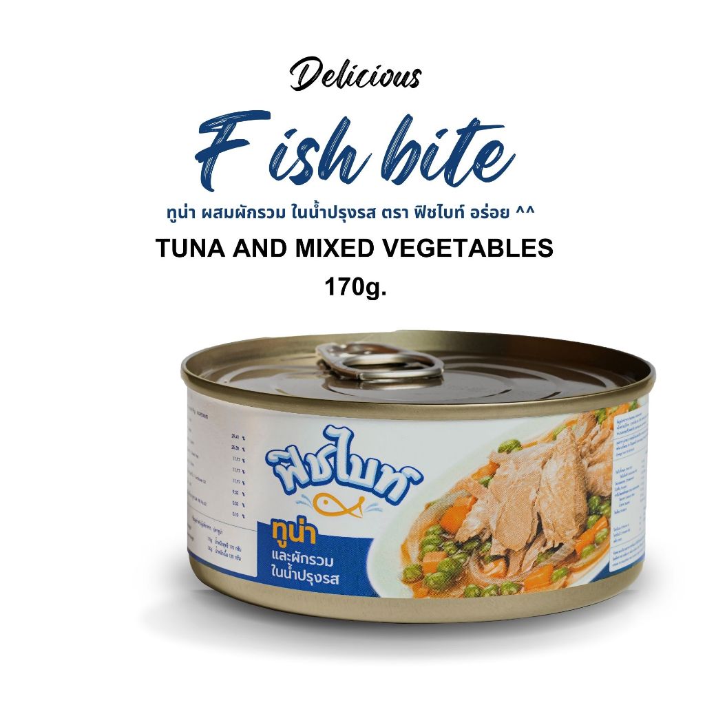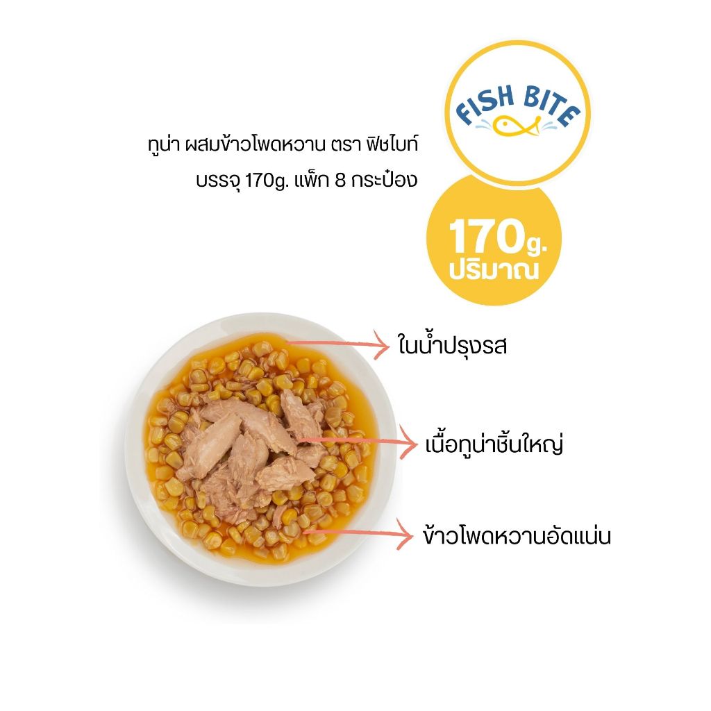 Fish Bite ทูน่าผสมผักรวม, ทู่น่าผสมข้าวโพดหวาน ในน้ำปรุงรส ขนาด 170g.