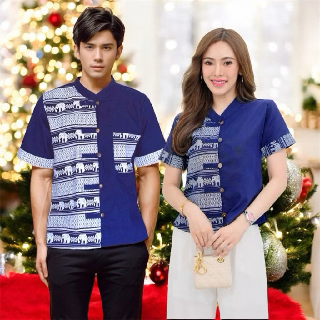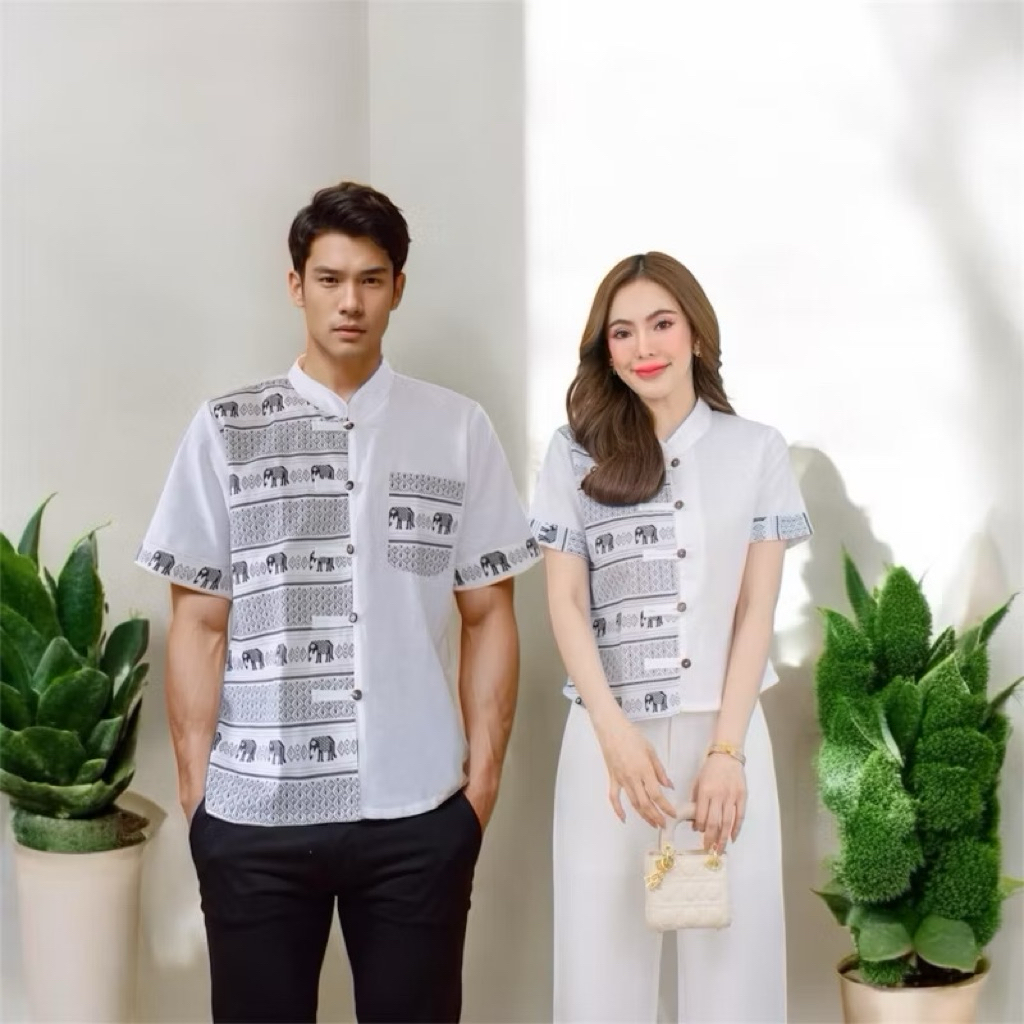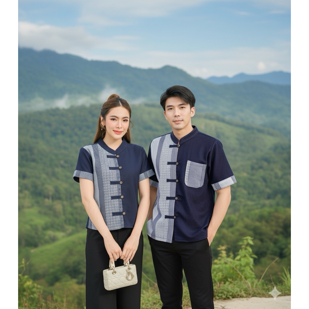 เสื้อพื้นเมืองผ้าฝ้ายแขนสั้นแต่งลาย เสื้อคู่ชาย/หญิง