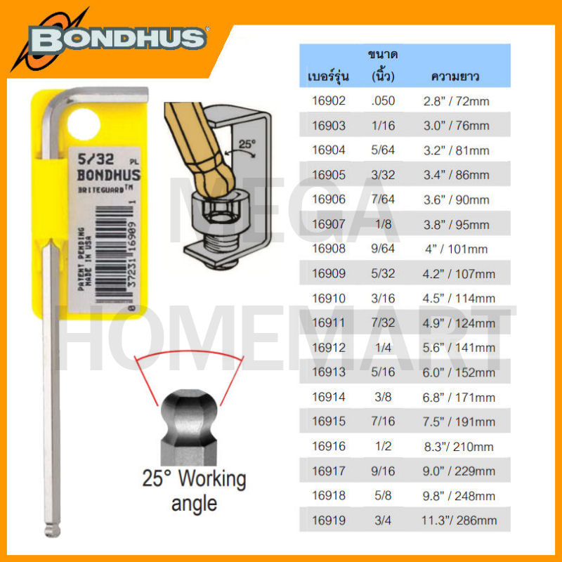 Bondhus ประแจหกเหลี่ยมตัวแอล หัวบอล สีเงิน ขนาด 0.050 นิ้ว - 3/8 นิ้ว รุ่น 16902 - 16914 (Balldriver L-Wrench Singles)