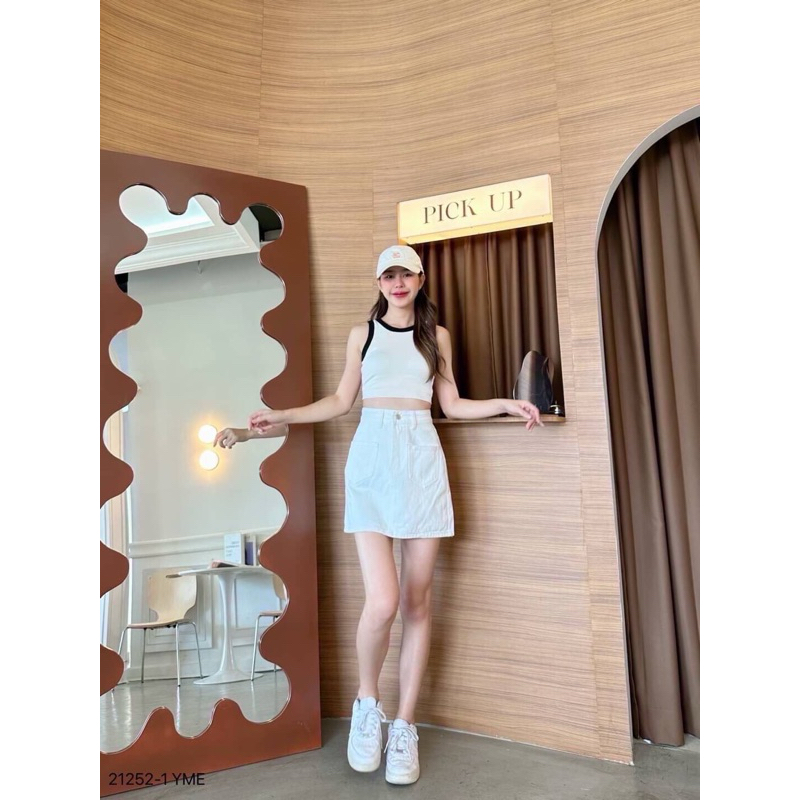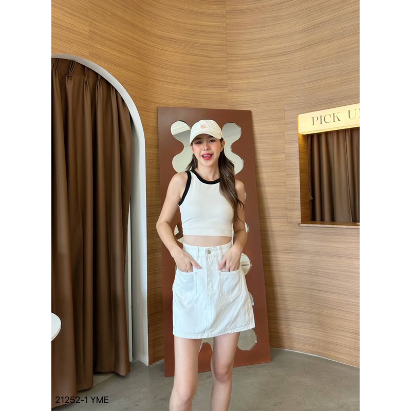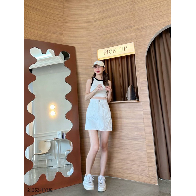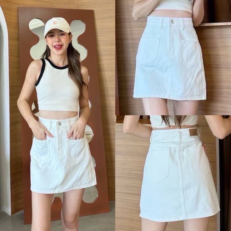 กระโปรงยีนส์เอวสูง แต่งกระเป๋าหน้า-หลัง ผ้าไม่ยืด ซับในกางเกง #YME21252