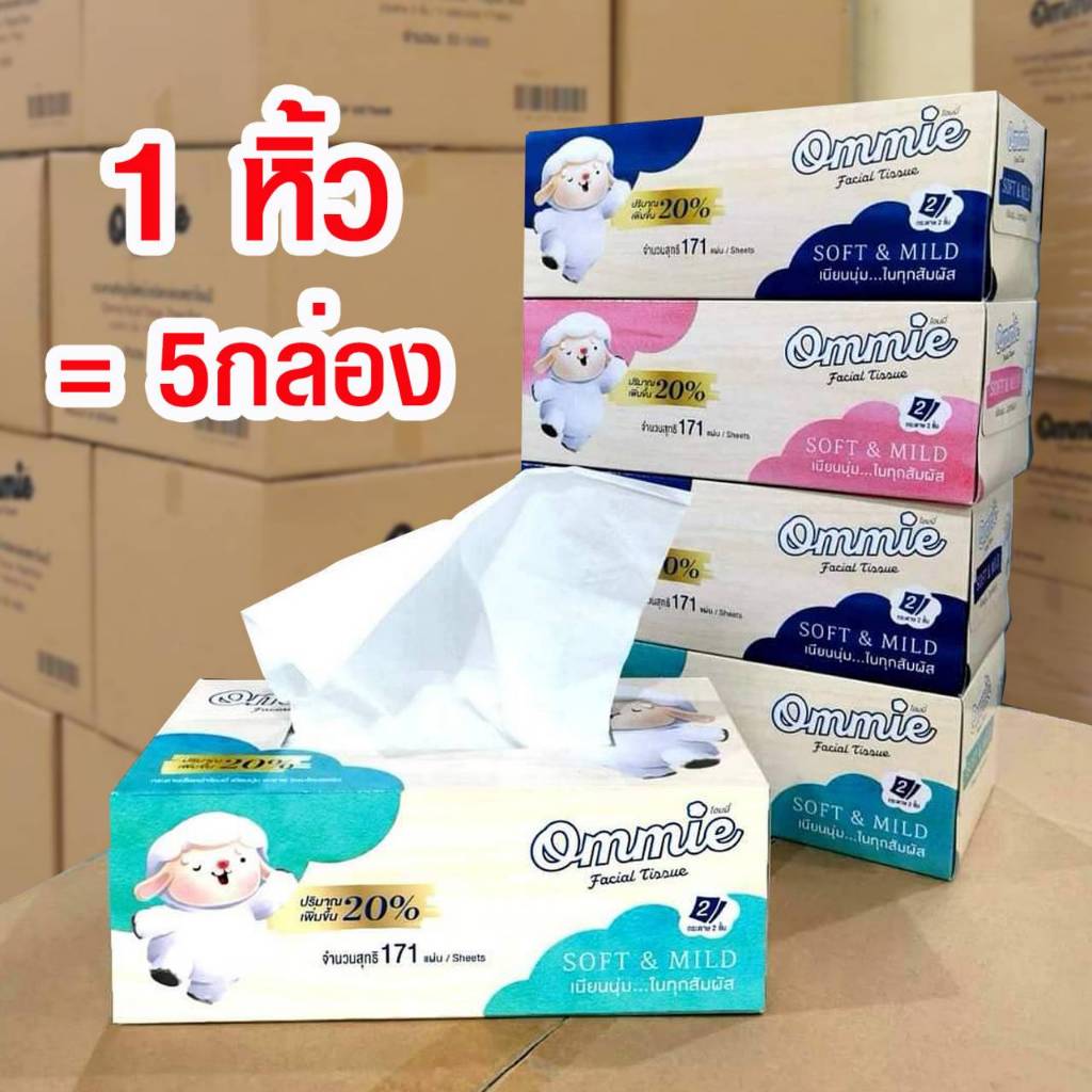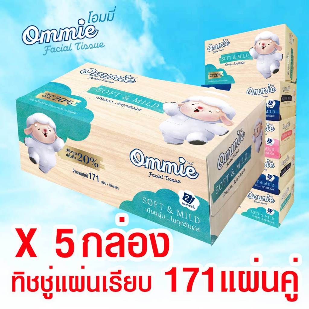 กระดาษทิชชู่เช็ดหน้า Ommie (โอมมี่) แบบกล่อง หนา 2 ชั้น 171 แผ่นคู่ แพ็ค 5 กล่อง