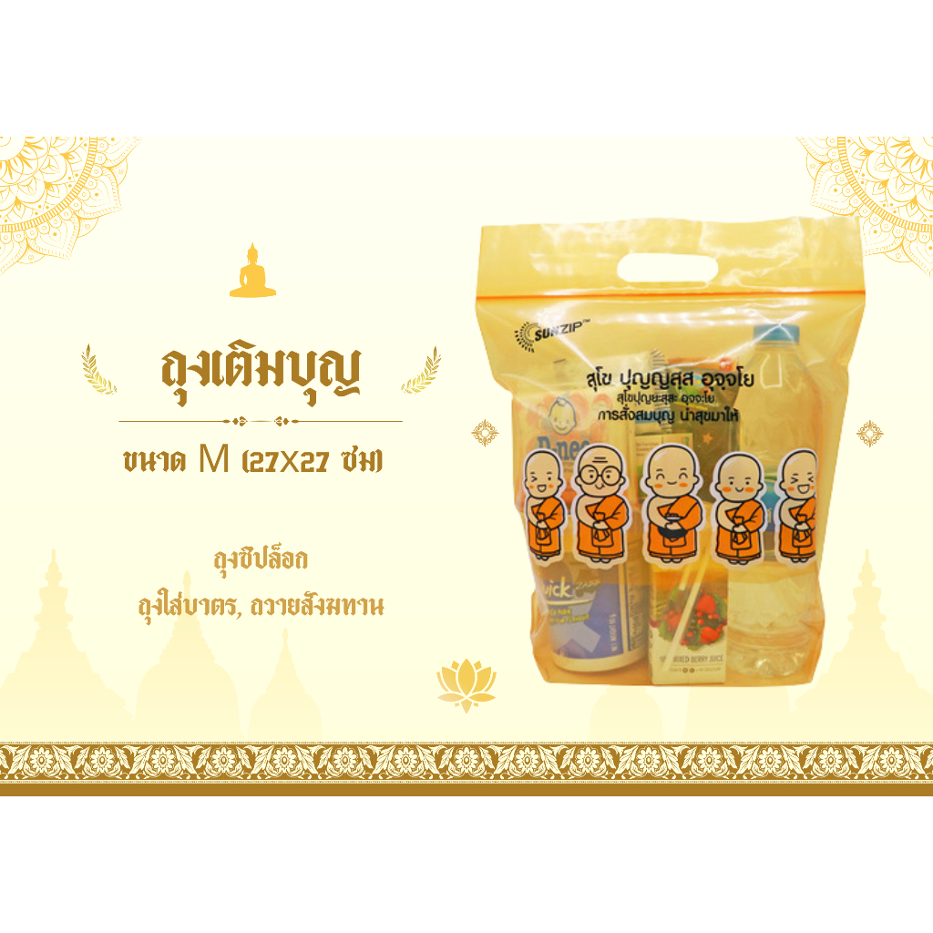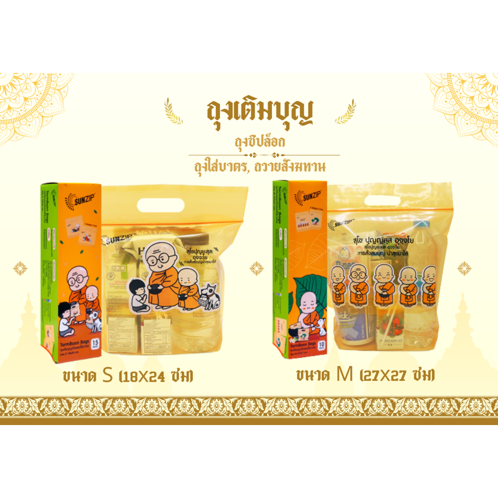 SUNZIP ถุงเติมบุญ ถุงใส่บาตร ถุงสังฆทาน แบบซิปล็อค มี 3 ขนาดให้เลือก
