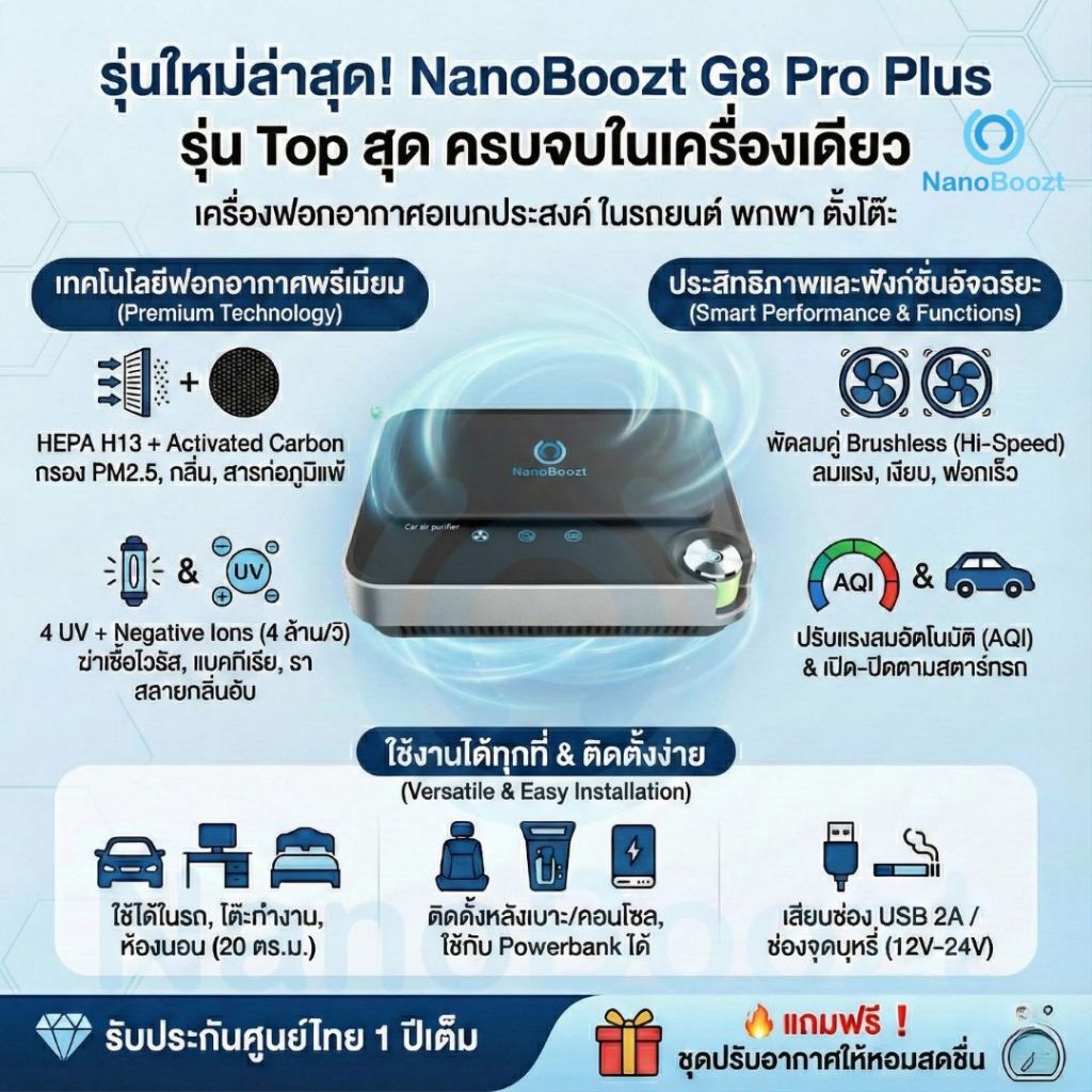 NanoBoozt เครื่องฟอกอากาศในรถยนต์ / ตั้งโต๊ะ G8 Pro / G8 Pro Plus รุ่น Top ใหม่ล่าสุด