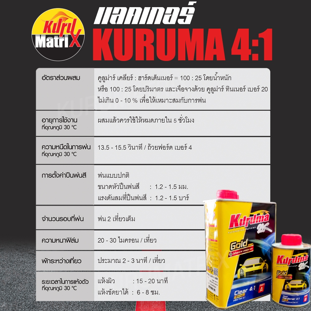 แลคเกอร์ 2K TOA KURUMA 4:1 [ชุดเล็ก] เคลือบเงา พร้อมน้ำยา (เนื้อ 0.8 ลิตร ฮาร์ดเดนเนอร์ 0.2 ลิตร)