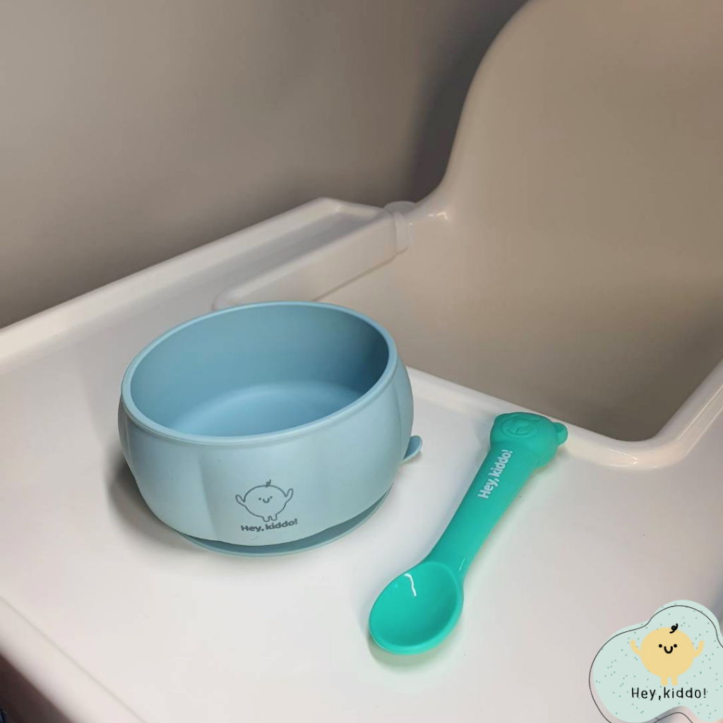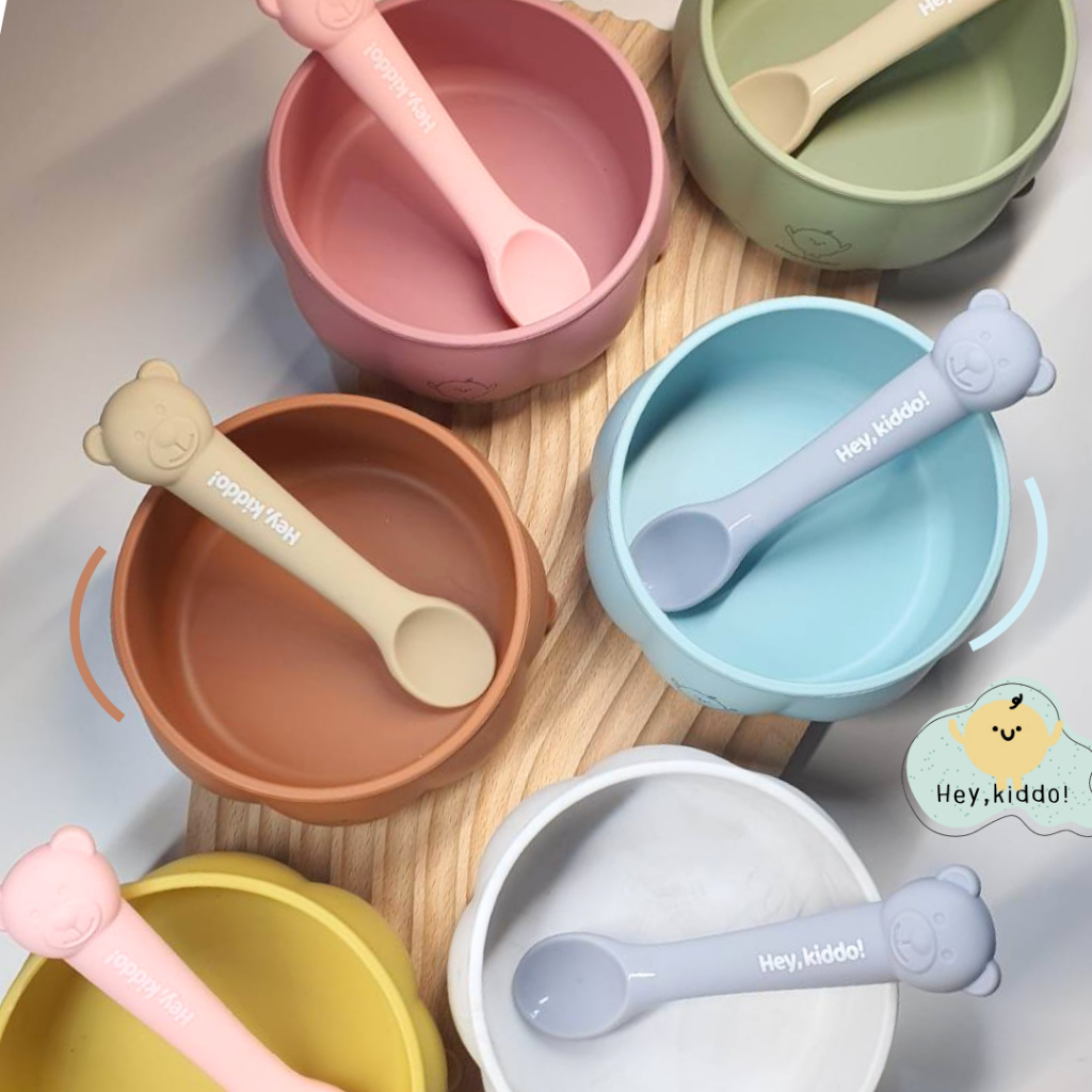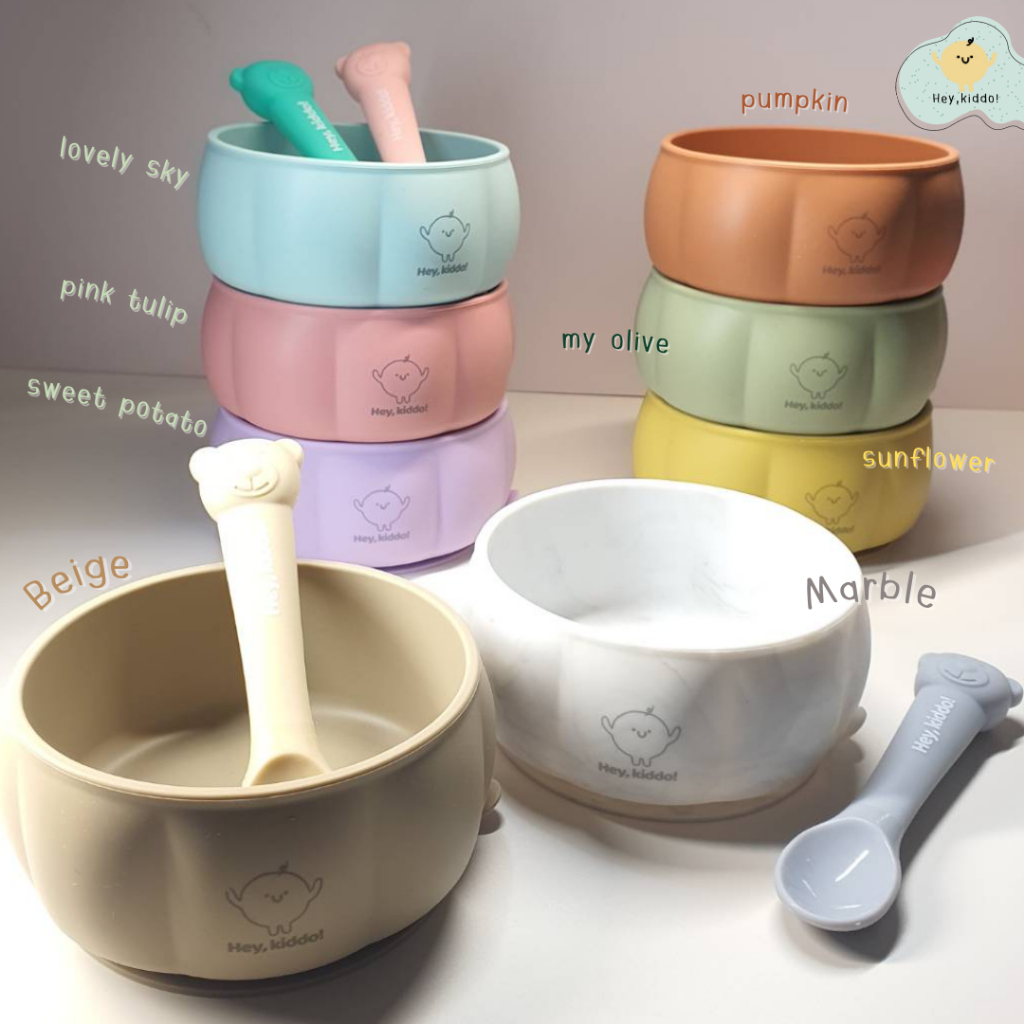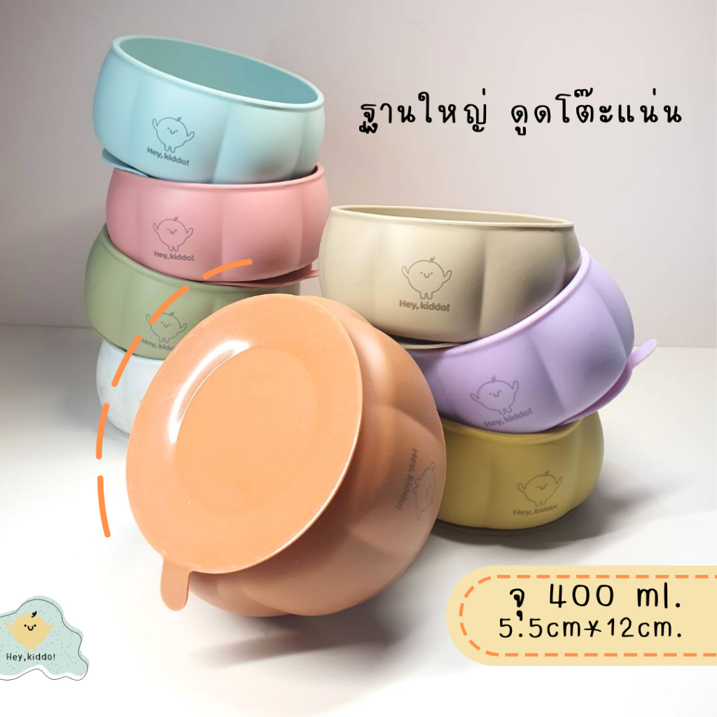 Heykiddo : เซทถ้วยซิลิโคนทานอาหาร + ช้อนป้อนซิลิโคน ถ้วยฟักทองพร้อมช้อนป้อนพี่หมี จุ 400 ml. ทนร้อนทนเย็น -20-200องศา