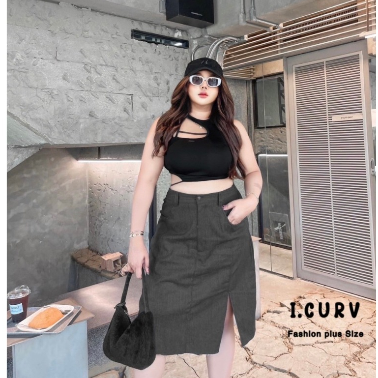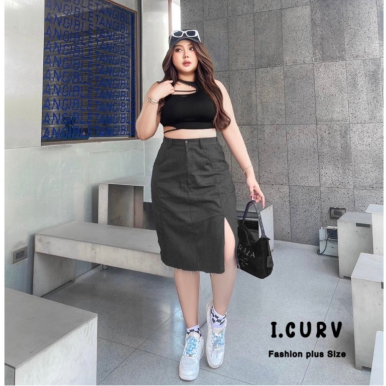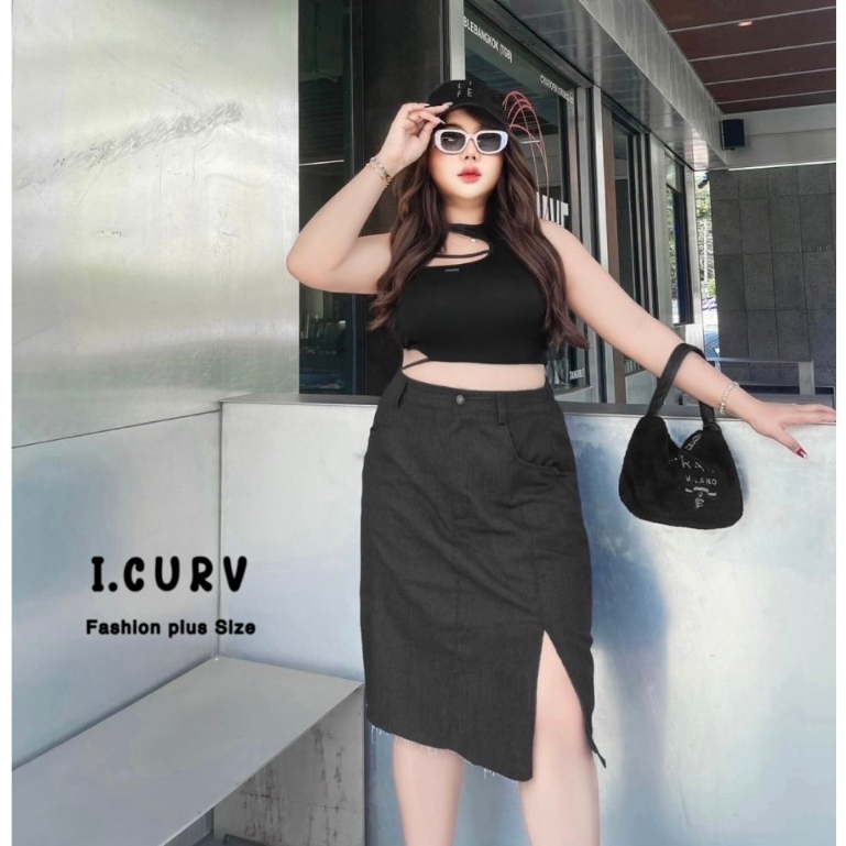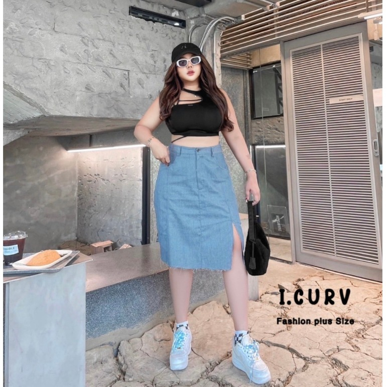 กระโปรงยีนส์ คลุมเข่า พลัสไซต์ ผ่าหน้า ไซต์ใหญ่ แฟชั่น สาวอวบอ้วน