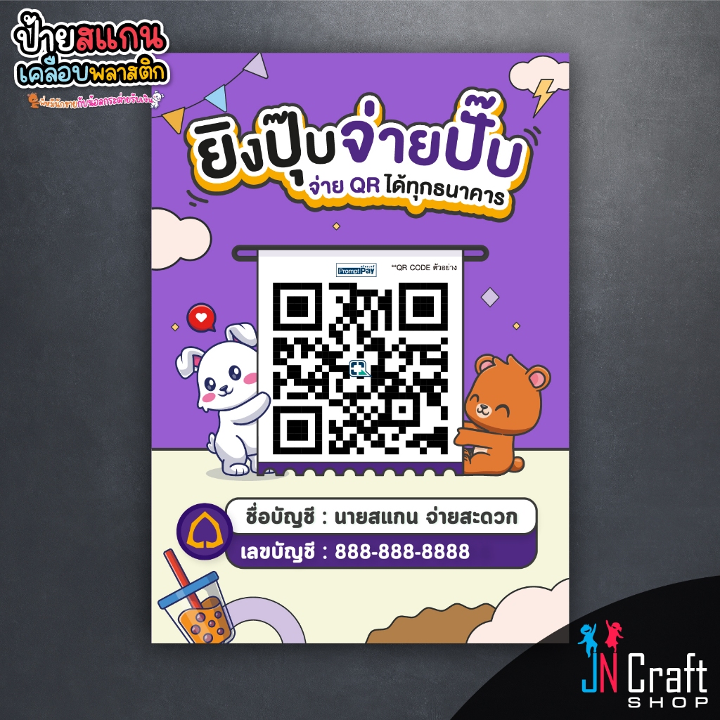 ป้ายสแกนชำระเงิน สแกน QR Code พร้อมเพย์ พี่หมีกับน้อลกระต่าย สไตล์น่ารัก (ป้ายเคลือบพลาสติก)