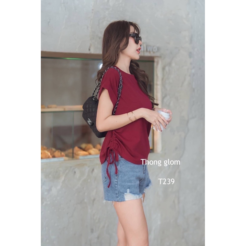 T239 เสื้อคอกลมแขนเบิ้ล ดีเทลรูดเชือกข้าง ทรงหลวม