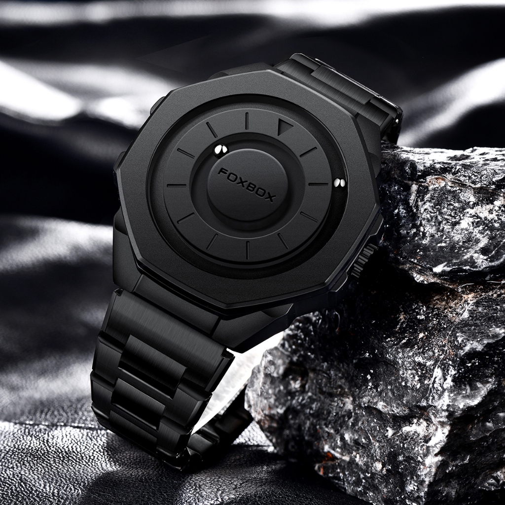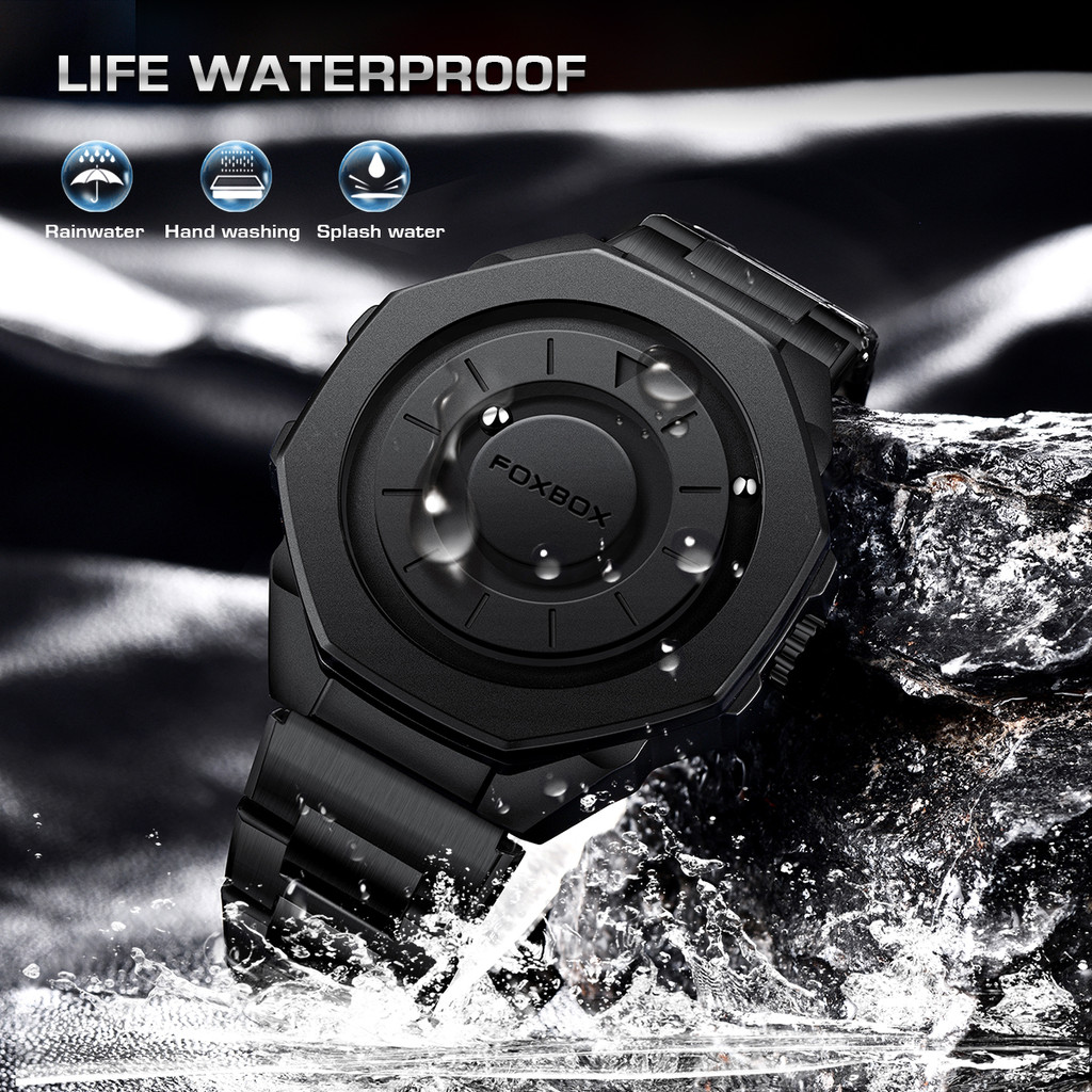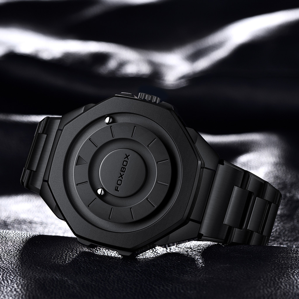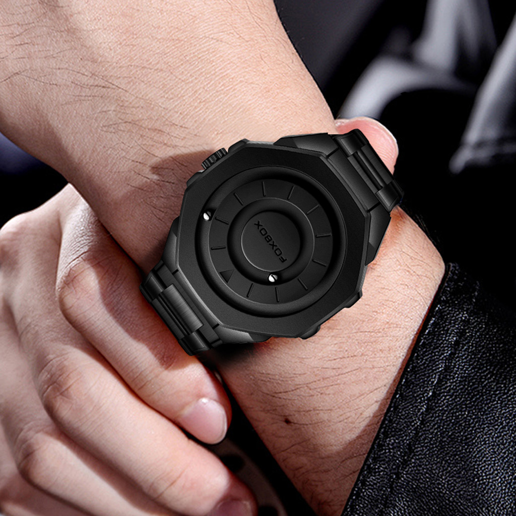 ฟ็อกซ์บ็อกซ์ นาฬิกาผู้ชายเดิมกันน้ํากีฬาสแตนเลสแม่เหล็กควอตซ์สีดํานาฬิกาข้อมือสําหรับผู้ชาย