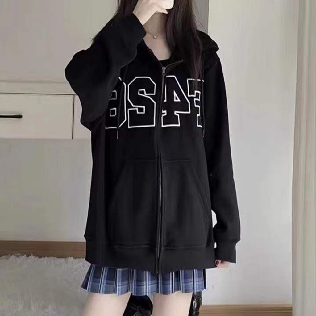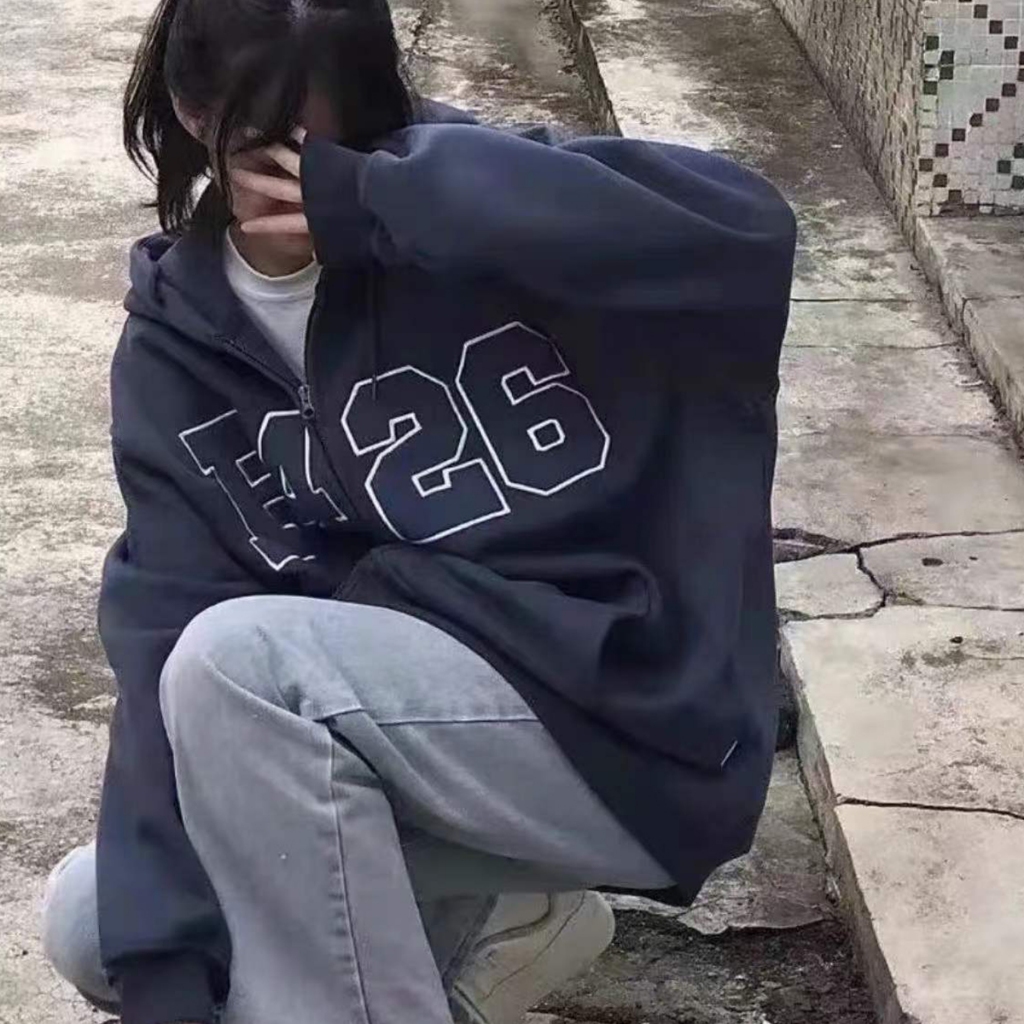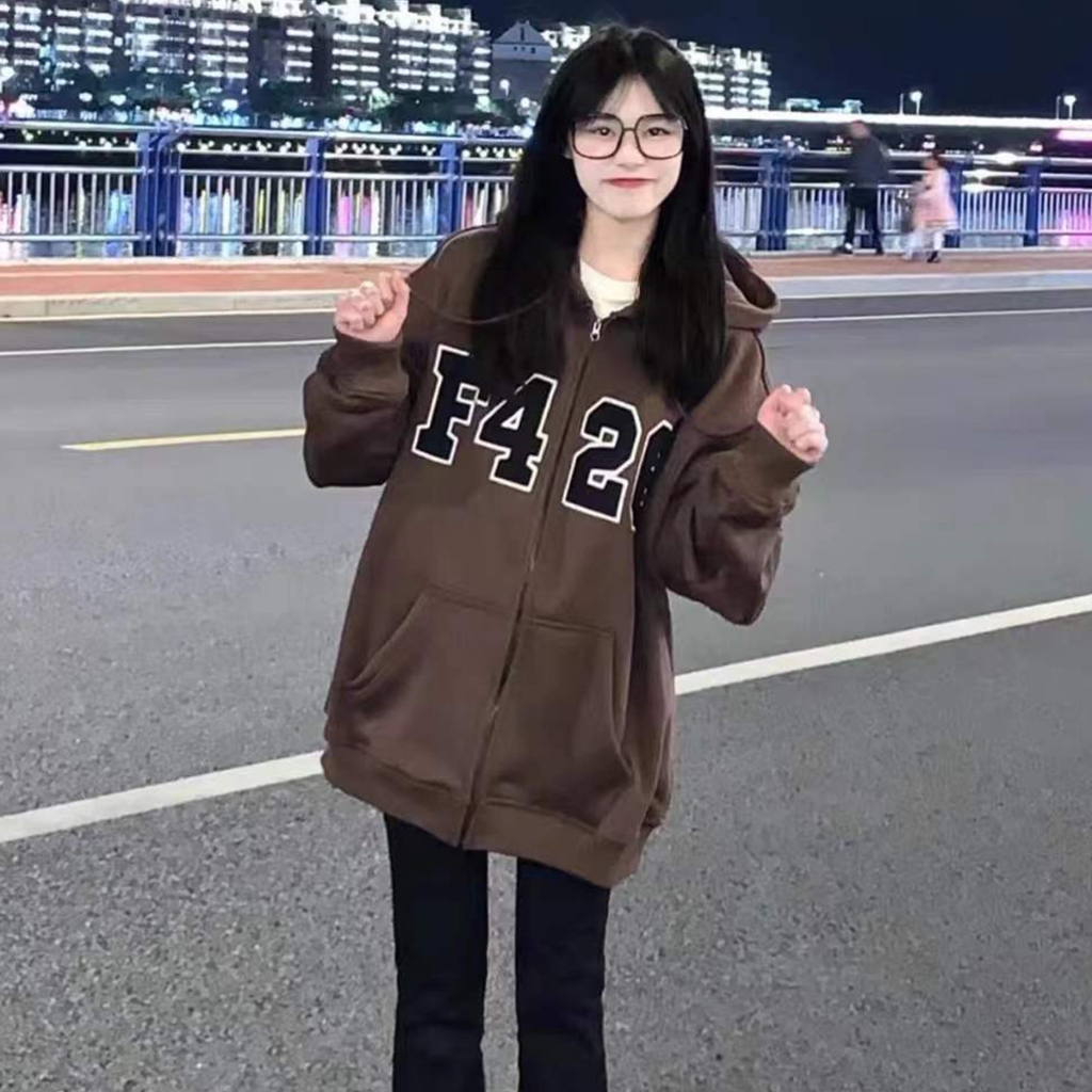 เสื้อแจ็กเก็ตกันหนาว มีฮู้ด แต่งซิป พิมพ์ลายตัวอักษร ทรงหลวม