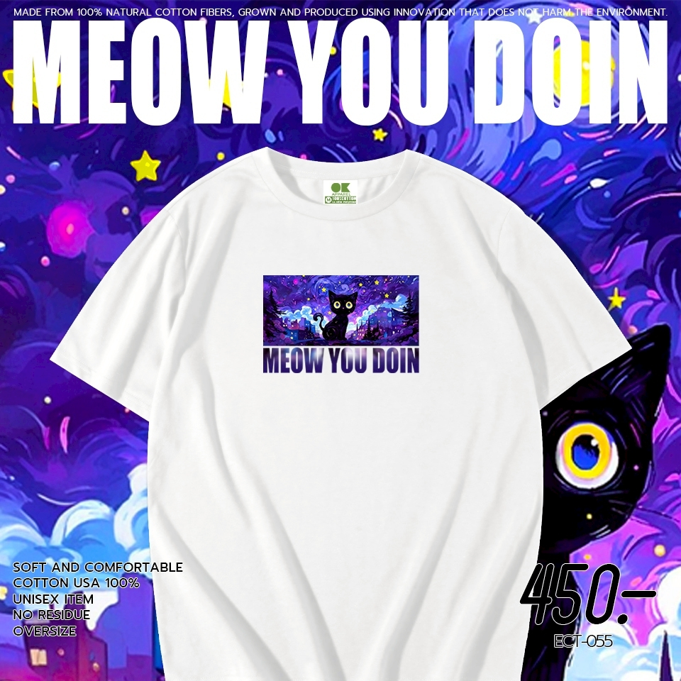 OK Apparel เสื้อยืดคอกลมแขนสั้น ลาย MEOW YOU DOIN Oversize Cotton ⚡️USAคุ้มสุด!⚡️