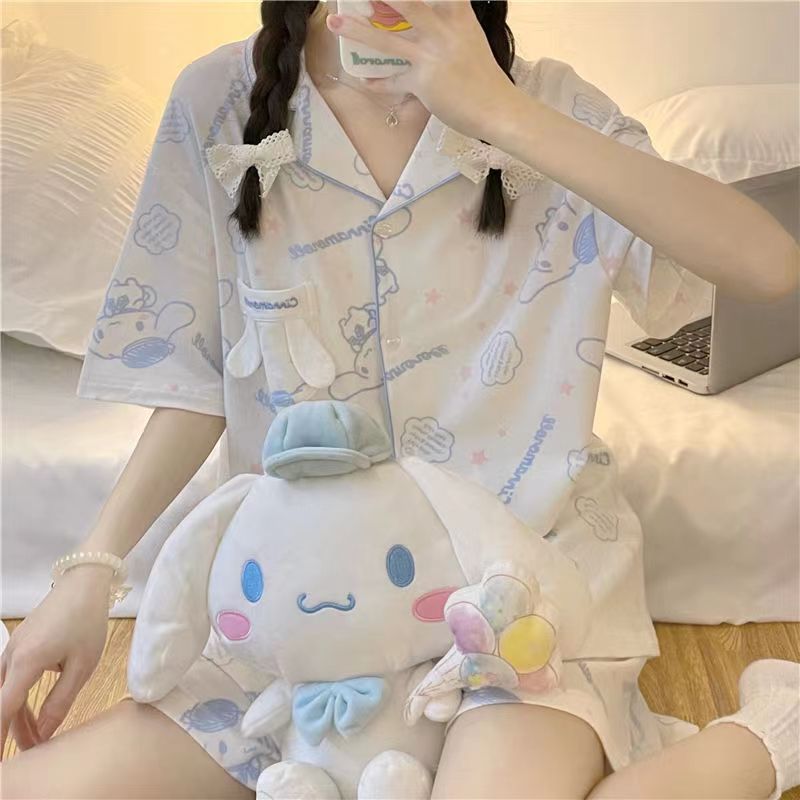 ชุดนอนลายการ์ตูนแขนสั้นขาสั้น ชุดนอนผ้าคอตตอน เนื้อผ้าบางเบาใส่สบาย วัสดุนี้บางและระบายอากาศได้ดี