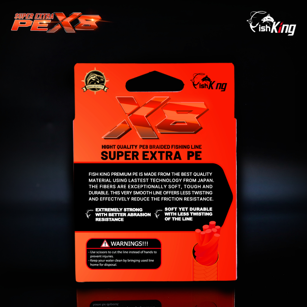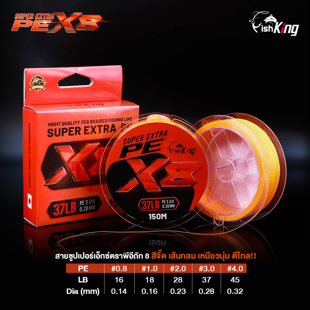 สายพีอีตกปลา แบรนด์ Fishking ถัก 8 SUPER EXTRA PE X8 ใหม่ล่าสุด2025 เส้นกลม เหนียว นุ่ม ตีไกล