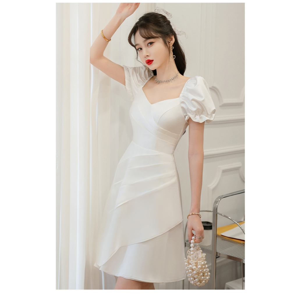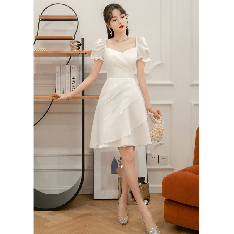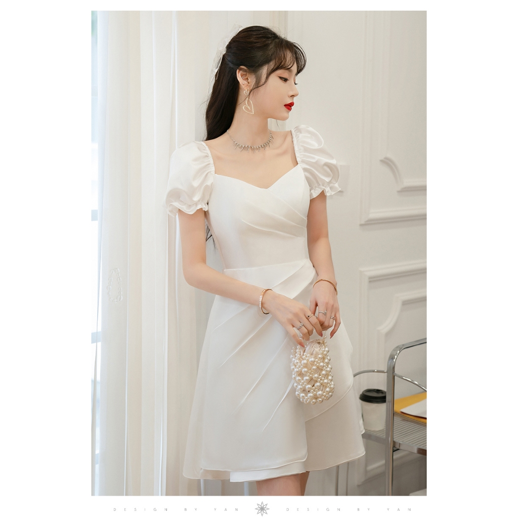 ชุดแฟชั่นสีขาว ชุดสีขาวกระโปรงหญิงสาวชุดฝรั่งเศสงานเลี้ยงกระโปรงสั้น