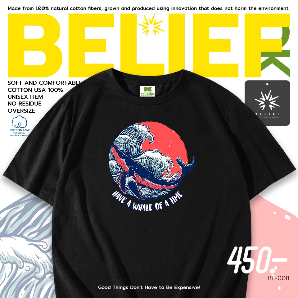 OK Apparel เสื้อยืดคอกลมแขนสั้น ลายวาฬคลื่น BE-008 ผ้าคอตตอนUSA100% OVERSIZE