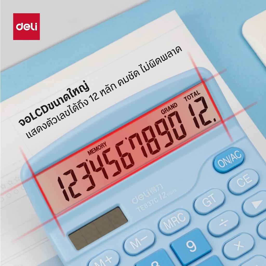 เครื่องคิดเลขบนโต๊ะ Deli 6 สี (สีน้ำเงิน สีเขียว สีขาว สีชมพู สีฟ้าอ่อน สีเขียวอ่อน)เครื่องคิดเลขสำหรับคำนวณ มีถึง12หลัก