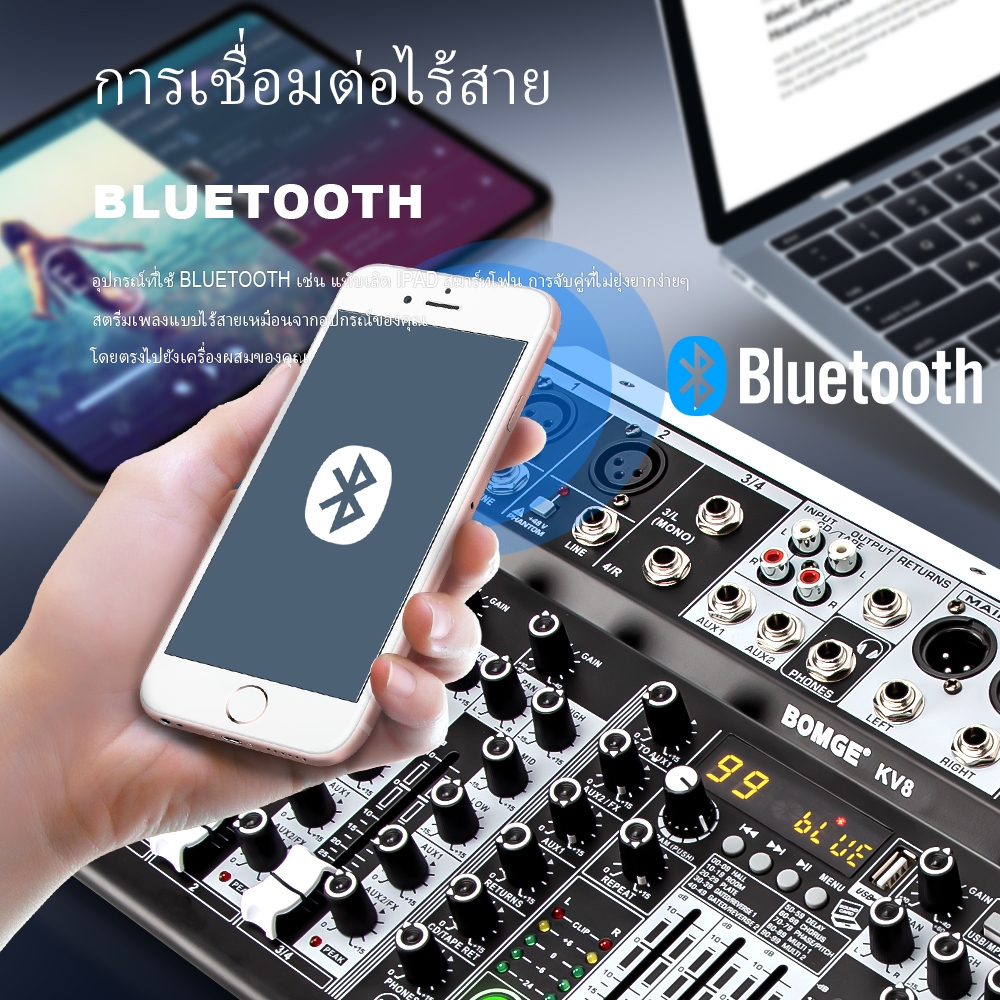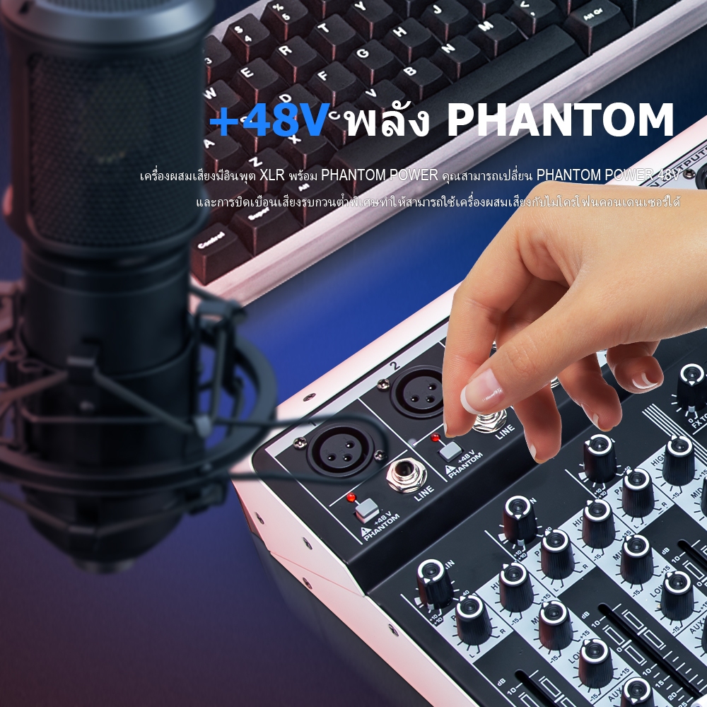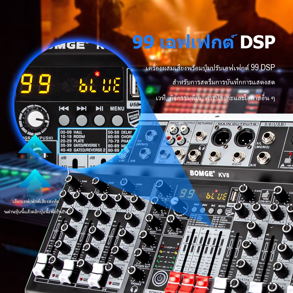 BOMGE มิกเซอร์ 4/6/8 ช่องสัญญาณ เอฟเฟกต์ Soundboard Mixer 99-Bit DSP DJ Reverb Audio Reverb Effect + 48V Phantom