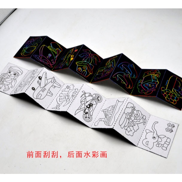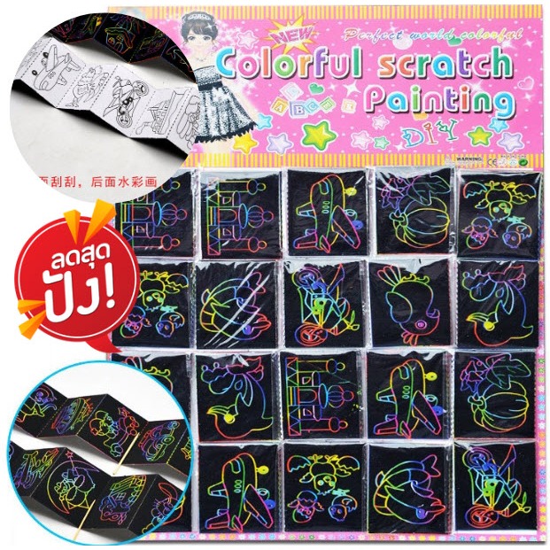 S0107 รุ่นการ์ตูน [พับ 8แผ่น] สมุดกระดาษขูด + ระบายสี (🎲สุ่มลาย) สำหรับเด็ก ฝึกสมาธิ วาดรูป ศิลปะ