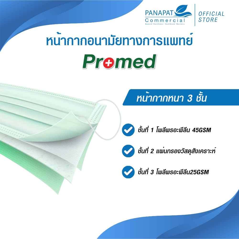 Promed หน้ากากอนามัย 3 ชั้น เกรดทางการแพทย์pm 2.5 สีเขียว (เเพค 2)