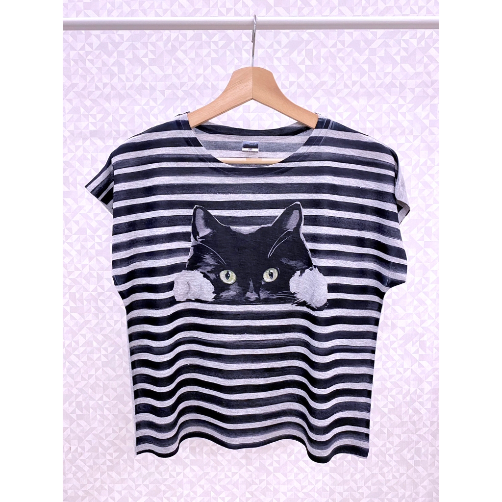 Freedเสื้อยืดแขนเลย สีเทา ลายแมว น่ารัก ผ้าไม่ต้องรีด