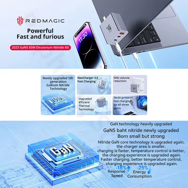 Original RedMagic DAO 65W GaN Charger Super Fast Charger 2C1A Red Magic GaN5 Chager + ชุดสายสําหรับแล็ปท็อปแท็บเล็ตเกมเครื่องโทรศัพท์มือถือ