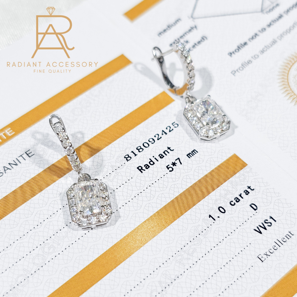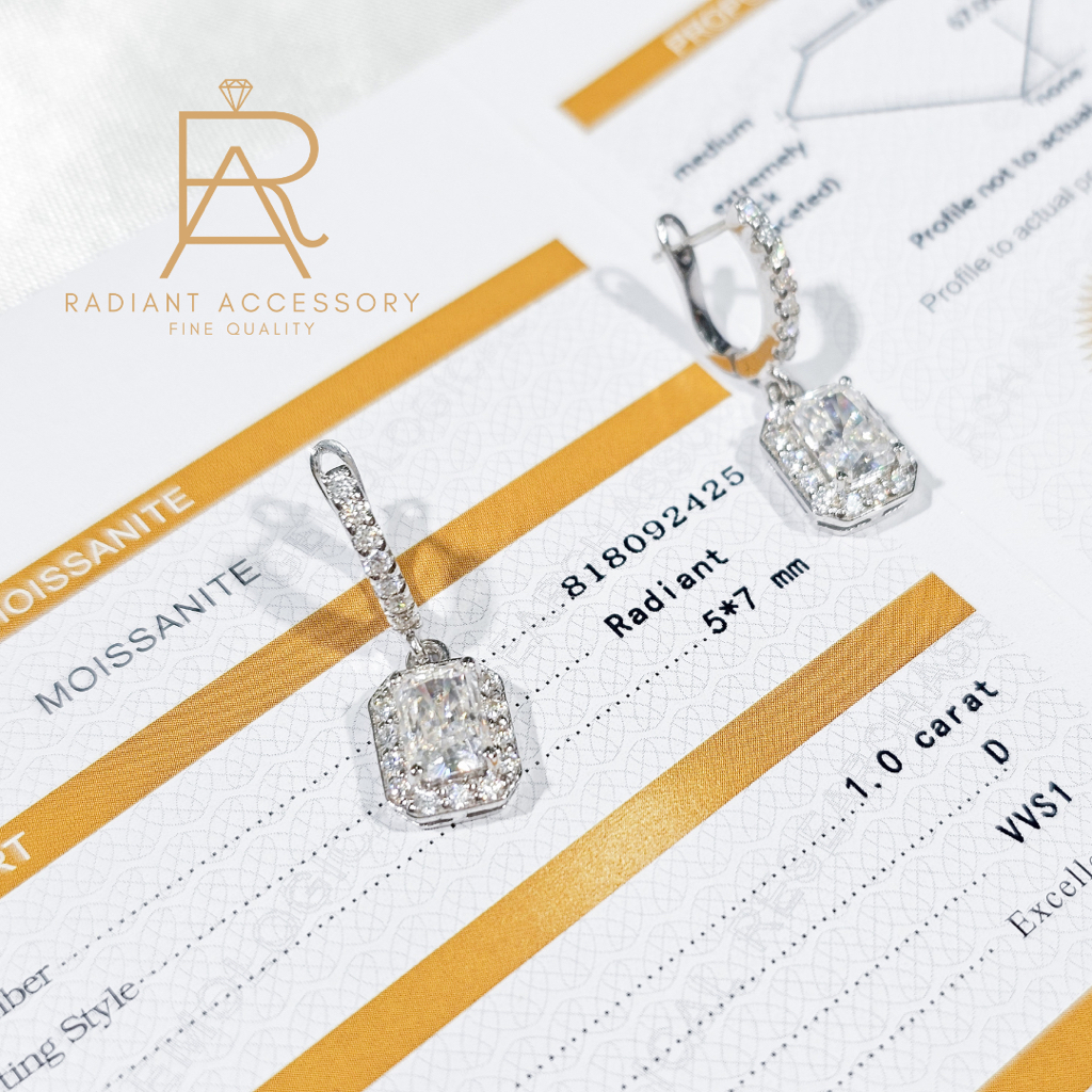 ต่างหูเงินแท้ ต่างหุตุ้งติ้ง ฝังเพชร Moissanite Radiant cut ชุบทองคำขาว