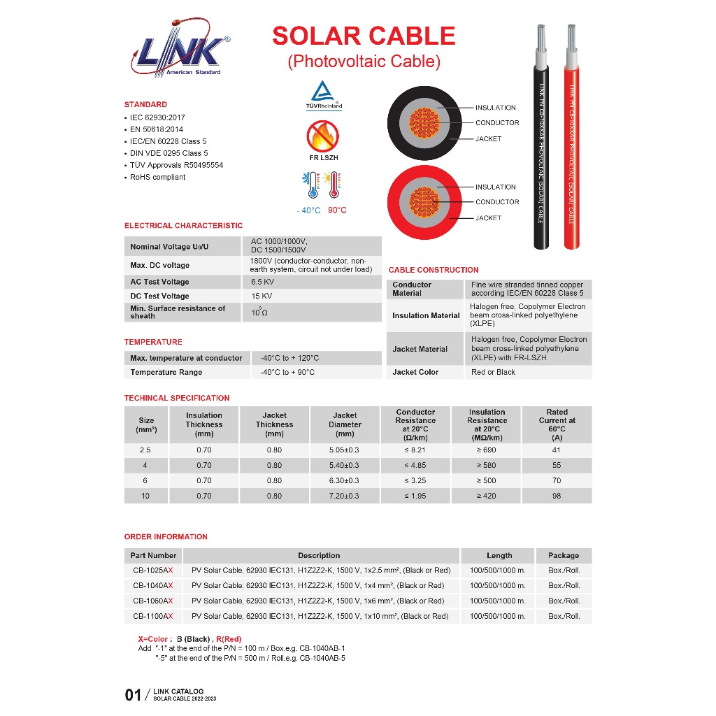 LINK CB-1040AR-1 สาย SOLAR CELL สีแดง ขนาด 1x4 mm² ความยาวม้วนละ 100 เมตร BY BILLIONAIRE SECURETECH