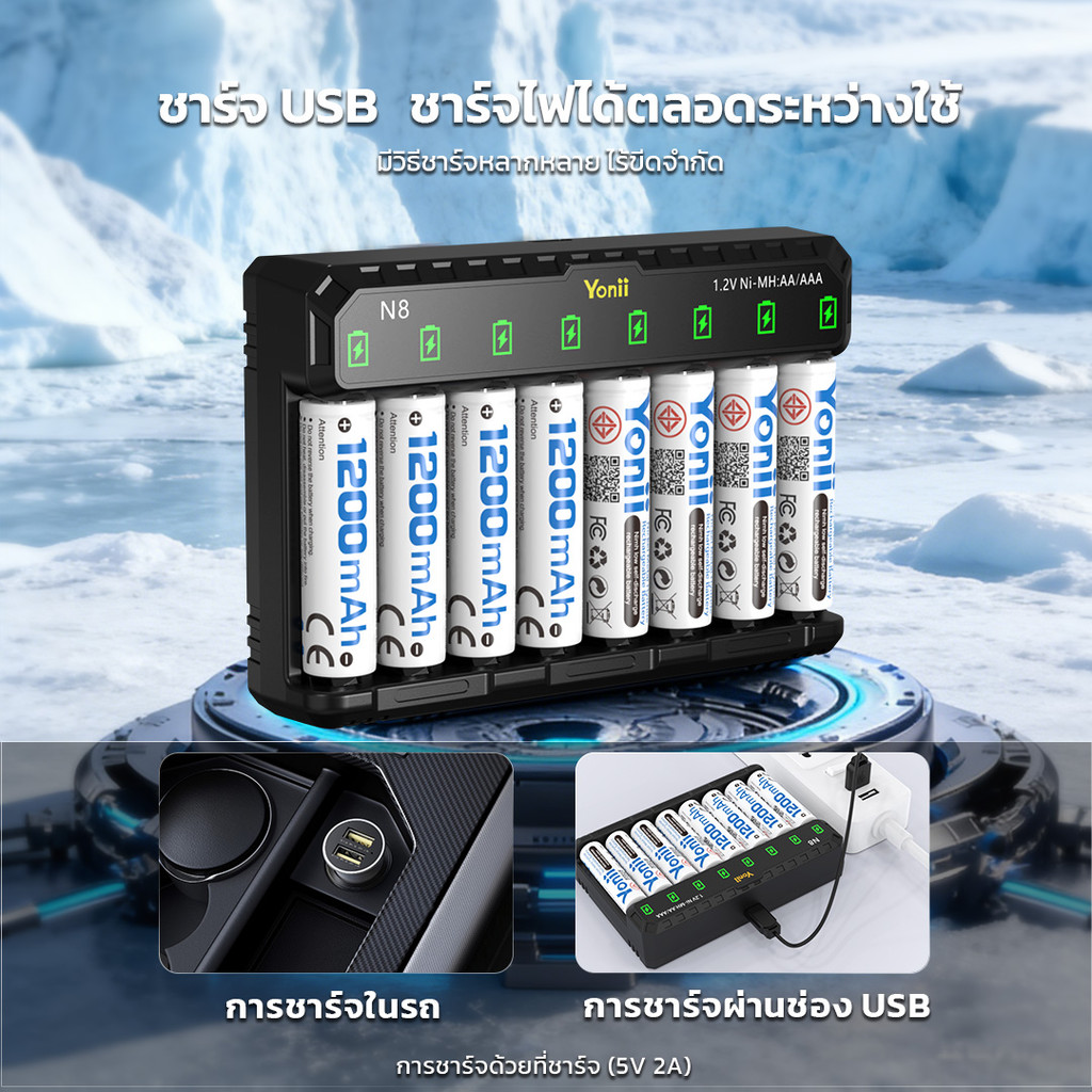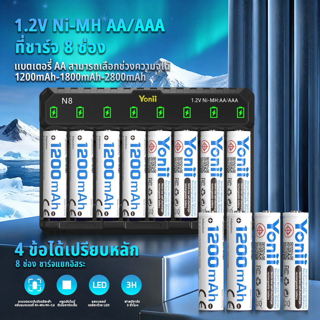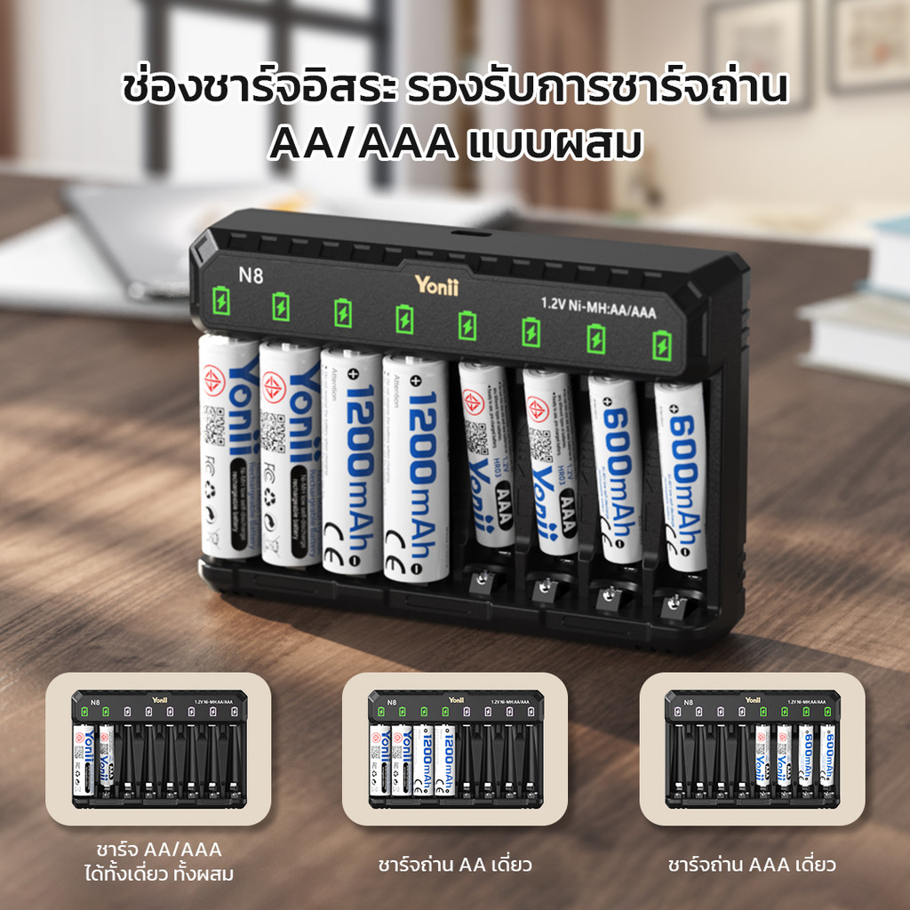 Yonii N8 ชุดถ่านชาร์จ AA AAA 8 ก้อน พร้อมเครื่องชาร์จ Ni-MH ความจุสูง ชาร์จเร็ว ใช้ซ้ำได้
