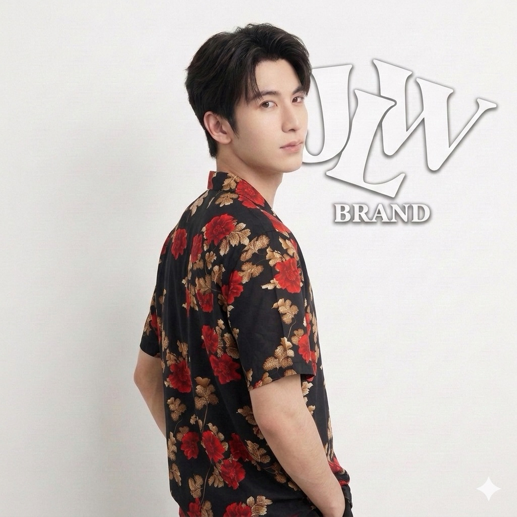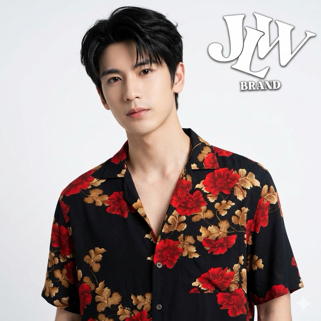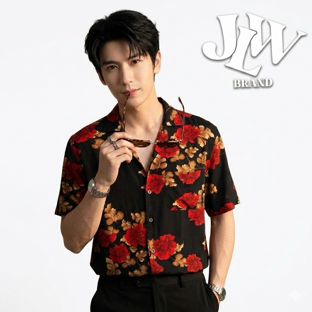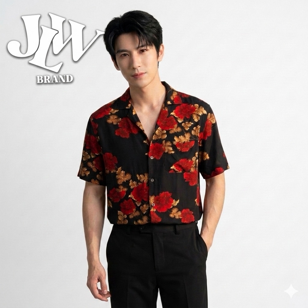 เสื้อฮาวาย ลายดำดอกแดง ผ้านิ่มใส่สบาย JLW BRAND ผ้าเรย่อน