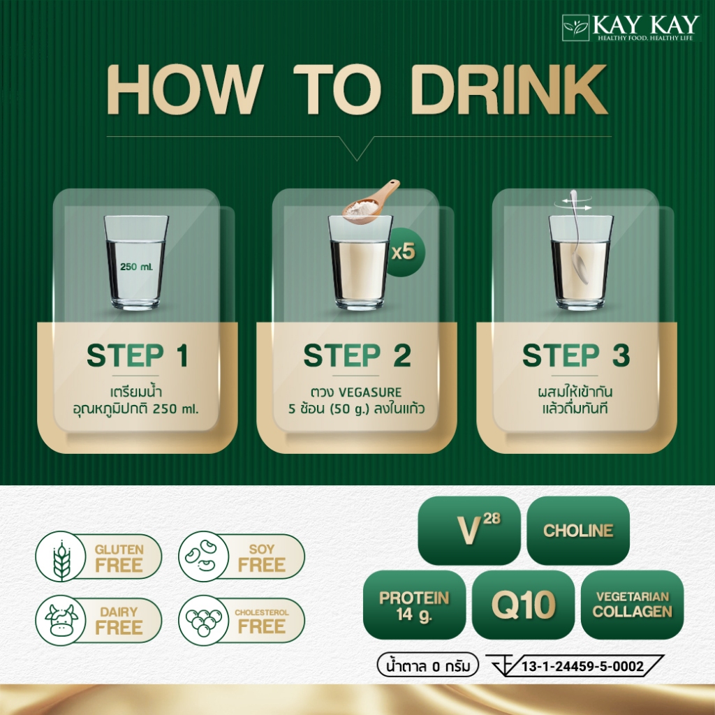 Kay Kay Vegasure สูตรใหม่ โปรตีนจากพืช 5 ชนิด ผสม HMB, CoQ10 และ Collagan ขนาด 500 กรัม