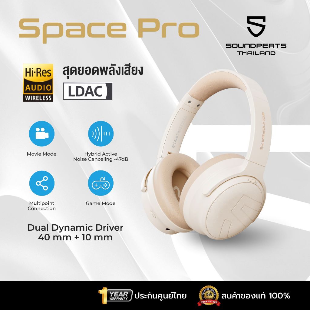[ประกันศูนย์ไทย] SoundPEATS Space Pro หูฟังครอบหู รองรับ Hi-res Headphones มี ANC ใช้ได้นาน 151 ชม. Movie mode full size