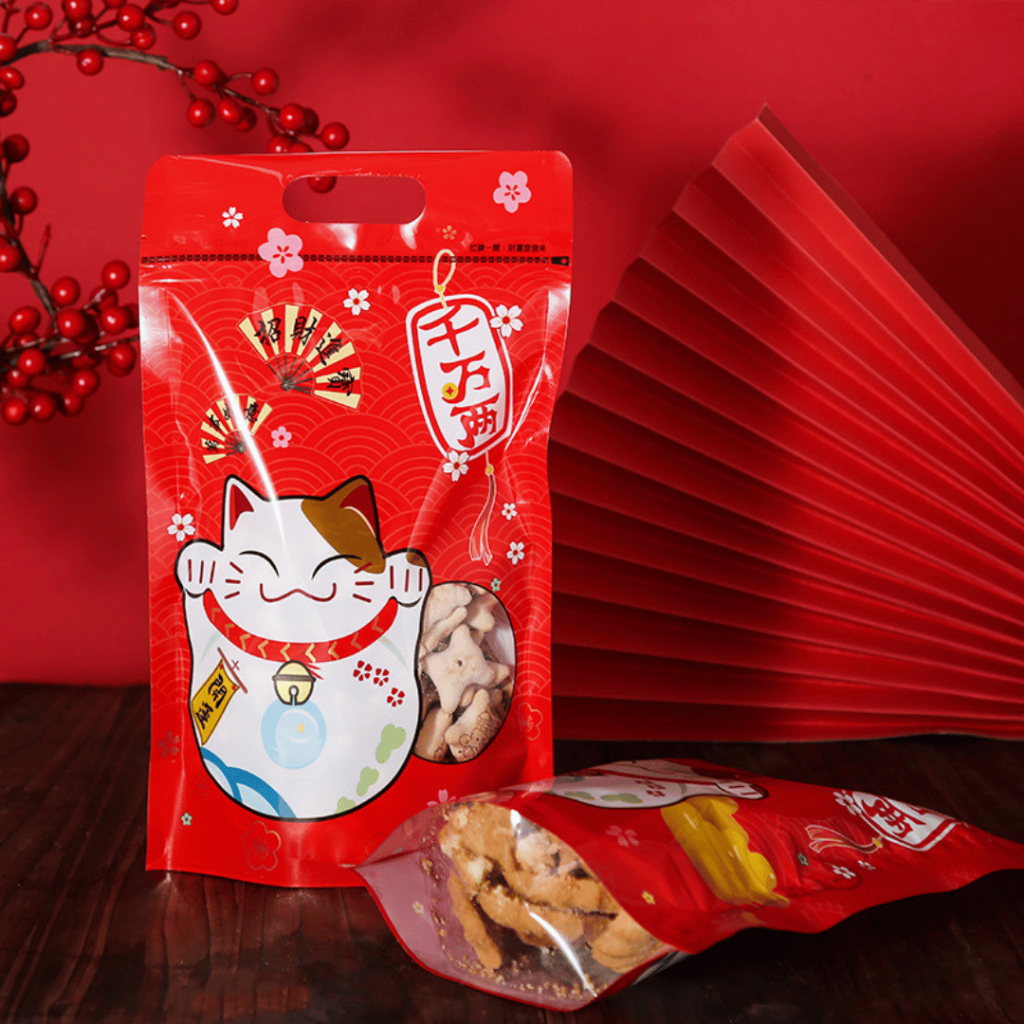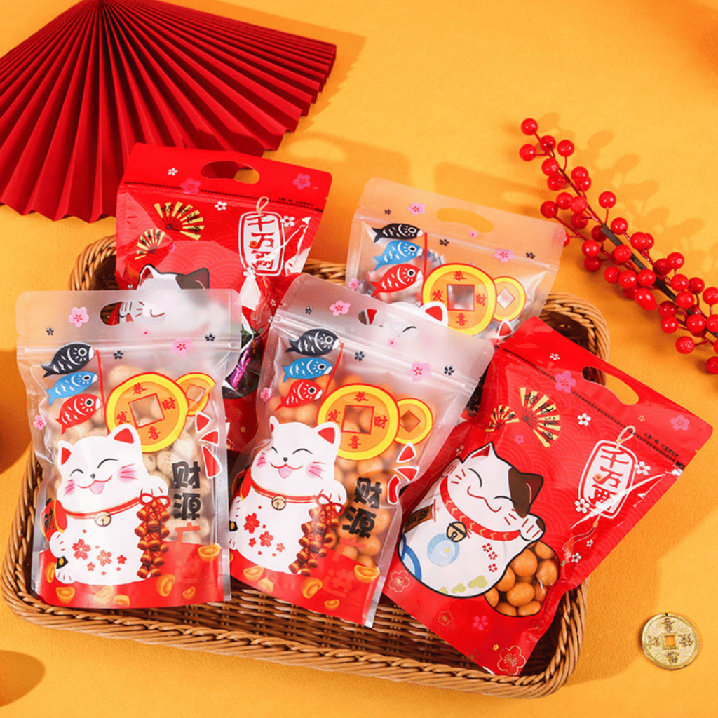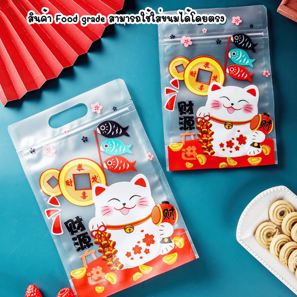 แพ็คละ 48-50 ใบ ถุงมีซิปปิดปากขยายก้นแบบตั้งได้พร้อมหูหิ้ว ลายแมวกวัก