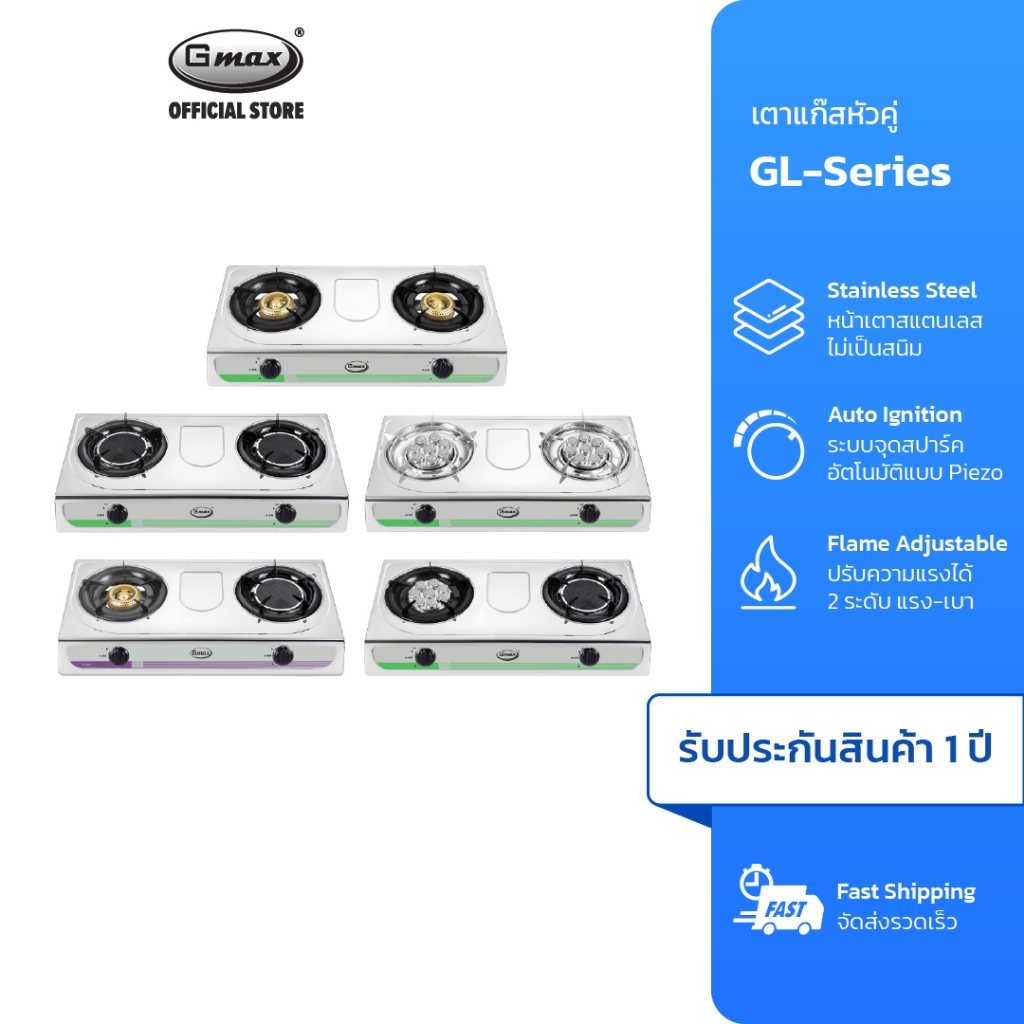 Gmax เตาแก๊สตั้งโต๊ะ 2 หัว Gas Stove หัวคู่ รุ่น GL-Series หน้าสแตนเลส เตาแก๊สตั้งโต๊ะ